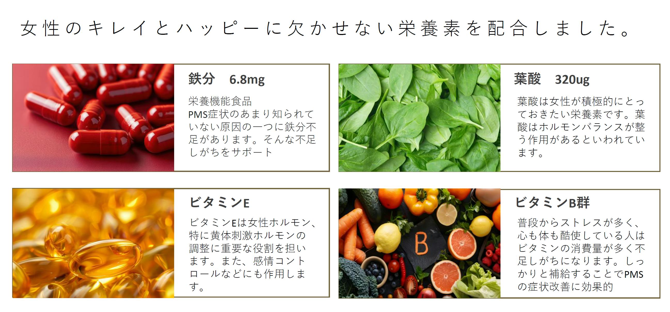 ■全成分:米糠・大豆エキス納豆菌発酵粉末(デキストリン、米糠・大豆エキス納豆菌発酵物)、チェストベリー、亜麻仁油、月見草油、バラ花びらエキス末、ザクロ果実、ピロリン酸第二鉄、ビタミンE、ビタミンB6、ビタミンB1、ビタミンB2、葉酸、ビタミンB12