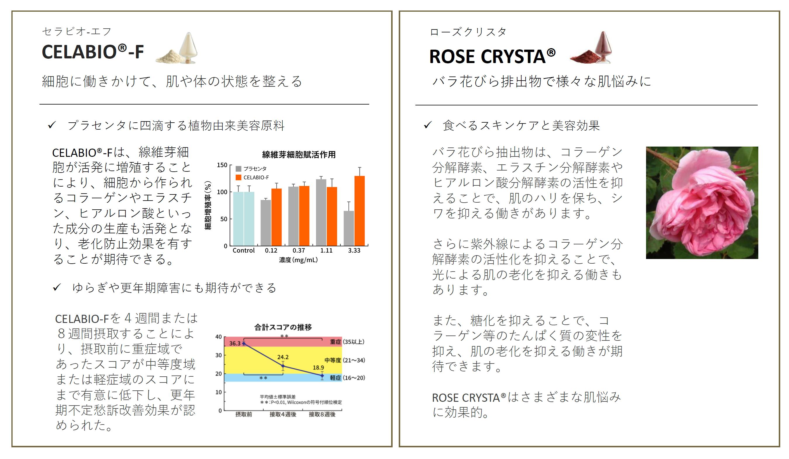 CELABIO®-Fやバラ花びらエキスといったこだわりの成分を配合し、体調や健康のサポートだけでなく、美容のサポートにも繋がります。