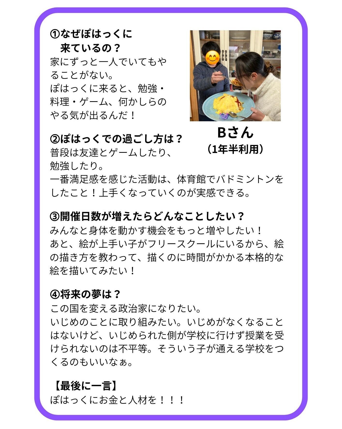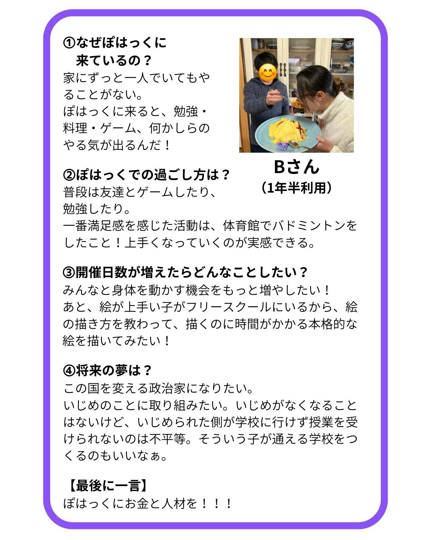 2024/09/20 14:30みなさんこんにちは。フリースクールぽはっく担当のロッキーです。9/19(木)23:59をもちまして、50日間のクラウドファンディングが終了しました!====================目標金額 1,650,000円(※)総支援額 2,196,000円支援者数 89名====================また、支援者数89名となっておりますが、石巻市内で開催された夏祭りにて、子どもたちが呼びかけをして集まったご支援も含ませていただいているので、実際の支援者数は150名を超えております。沢山の方々に支えていただき、目標を達成することができました!みなさま本当に本当にありがとうございます!今回のクラウドファンディングでは、途中でプロジェクト内容の変更を余儀なくされ、最終的には『受け入れ人数(定員)を増やす』という目標に絞ることになってしまいました。しかし、『開催日数を増やす』ということも変わりなく必要なことだと感じています。クラウドファンディング最終日の昨日は、16名の子どもが来所していました。目標金額を達成したことで受け入れ人数を増やすことができますが、それでも石巻市の『不登校』数に対して、定員20名は決して多い数字ではありません。クラウドファンディング終了がゴールではありません。まだまだ『不登校』を取り巻く課題が沢山あるので、私たちはこれからさらに精進してまいります!!!この度は、ご支援・応援・ご協力本当にありがとうございます。フリースクールぽはっく担当 千葉拓己※目標金額は、当初の332万円から165万円に変更となっております。クラウドファンディングページのシステム上、webサイトに表示される目標金額は当初の金額となっております。下記URLに記載しております。https://camp-fire.jp/projects/774354/view/activities/618298#main もっと見るプロジェクトの目標内容変更についてお知らせ