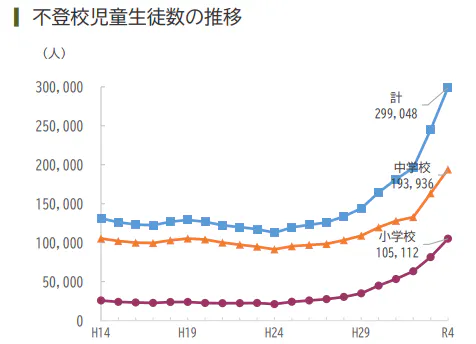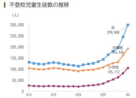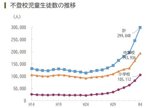 全国的に増えている不登校数。2022年度、小・中学生の不登校数は29万9048人でした。(文部科学省HPより)