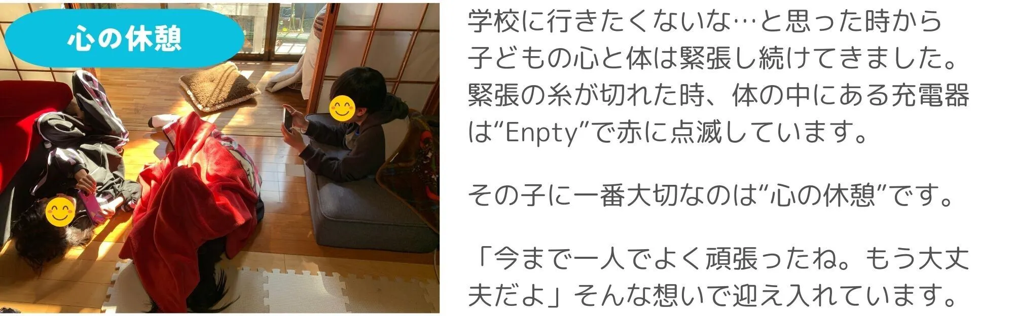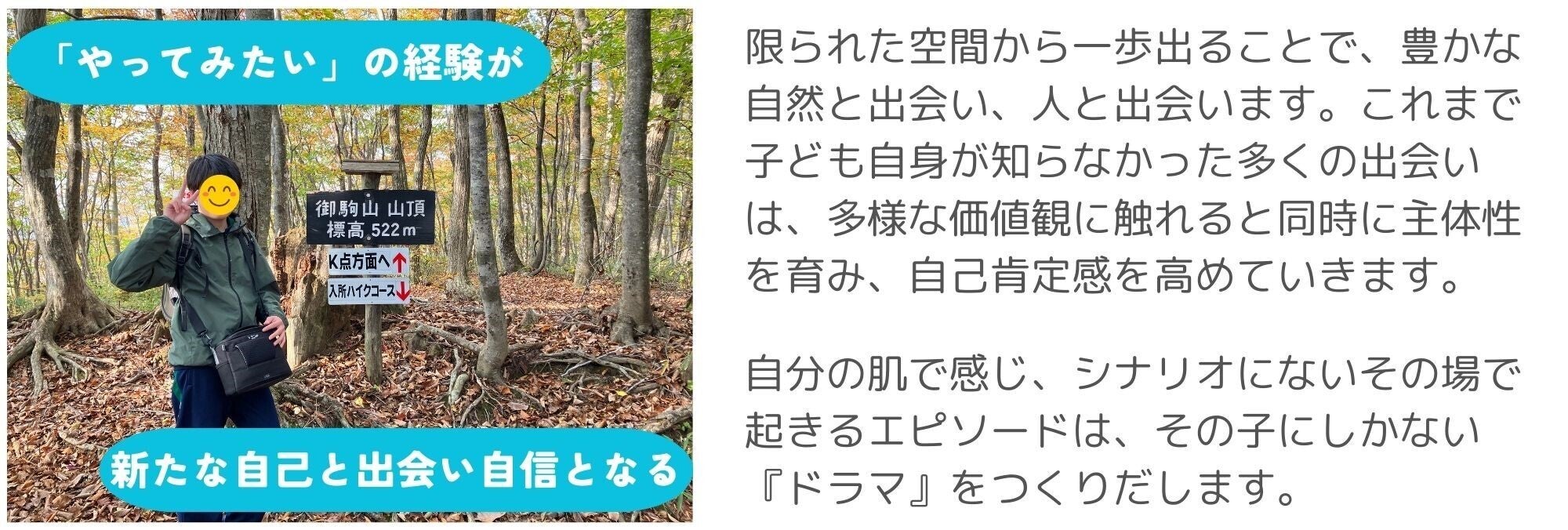 なぜなら、多くの『不登校』の子どもは自分に自信を失っているからこそ、小さな「やってみたい」の成功体験から自己肯定感を取り戻すことができるからです。