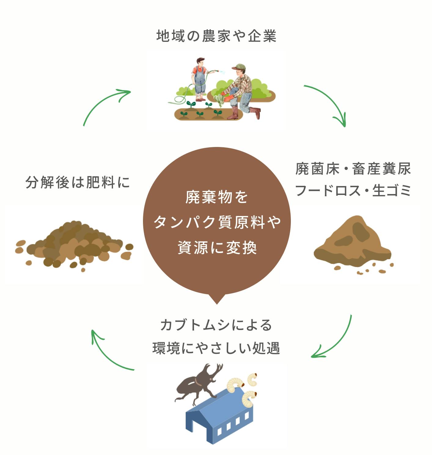 しいたけ工場などで出る廃菌床(しいたけが生えなくなった使用済のブロックのこと)などの有機廃棄物をカブトムシのエサにすることで、産業廃棄物削減に貢献できますし、排出された糞は、果樹や野菜などの肥料として農家さんに利用していただくこともできます。