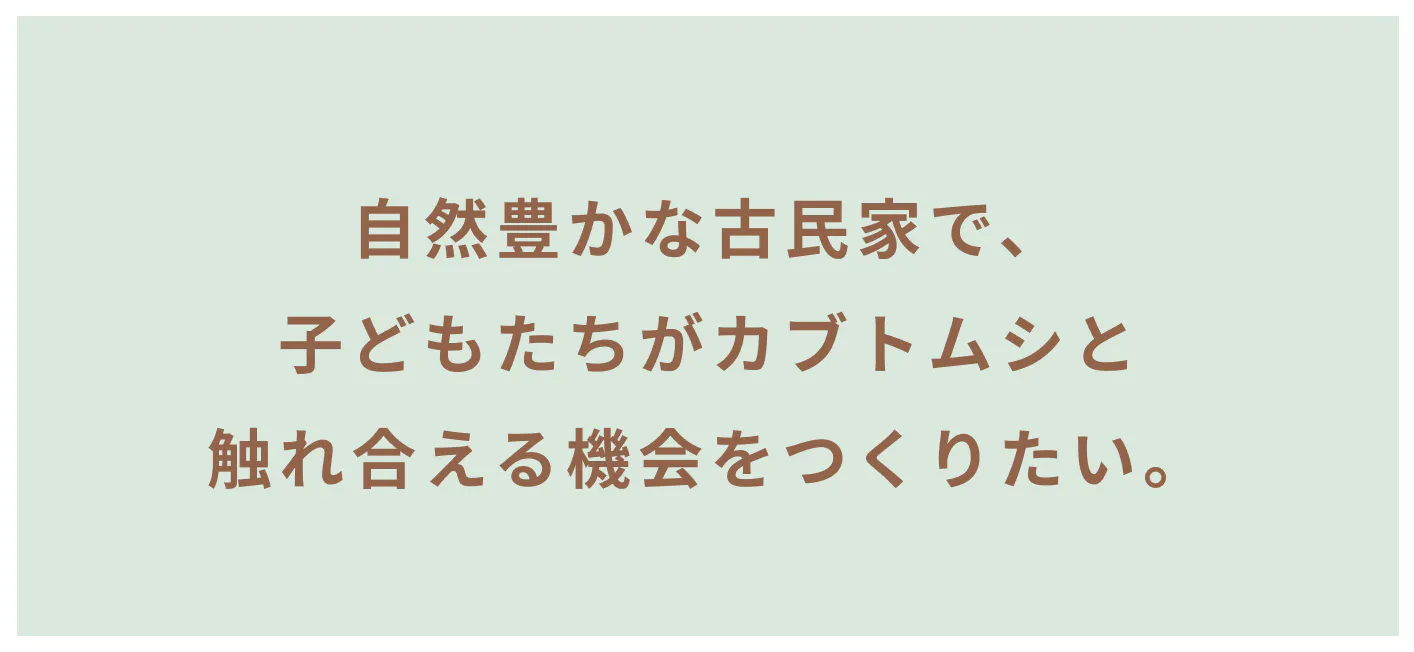 そこで私たちは、古民家をカブトムシ飼育のための適切な環境に整え、子どもたちが気軽に昆虫と触れ合える場所を作っていきたいと考えました。