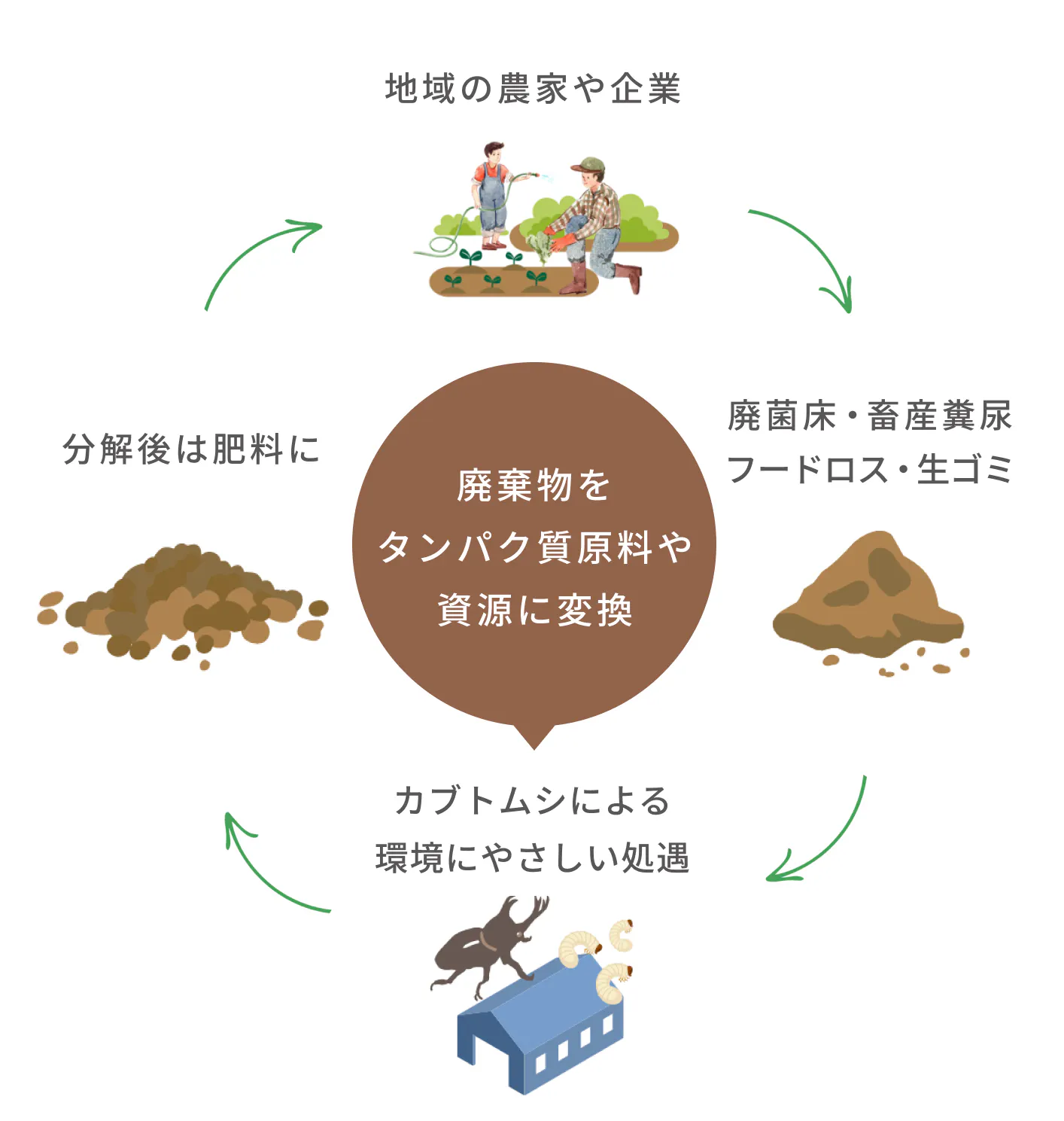 しいたけ工場などで出る廃菌床(しいたけが生えなくなった使用済のブロックのこと)などの有機廃棄物をカブトムシのエサにすることで、産業廃棄物削減に貢献できますし、排出された糞は、果樹や野菜などの肥料として農家さんに利用していただくこともできます。