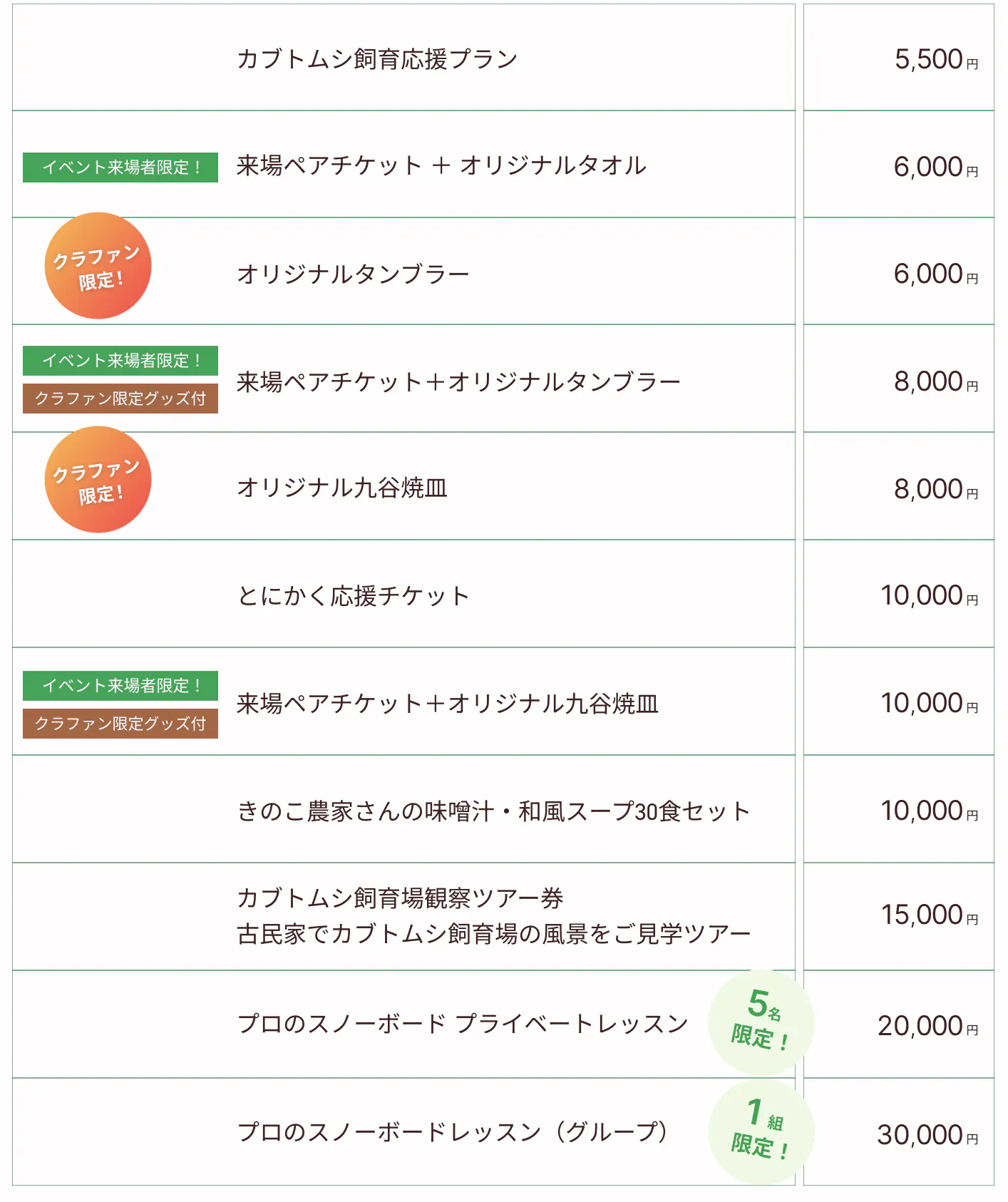 イベントに参加できるチケットやカブトムシの飼育場観察ツアーなど様々なリターン品をご用意いたしました。