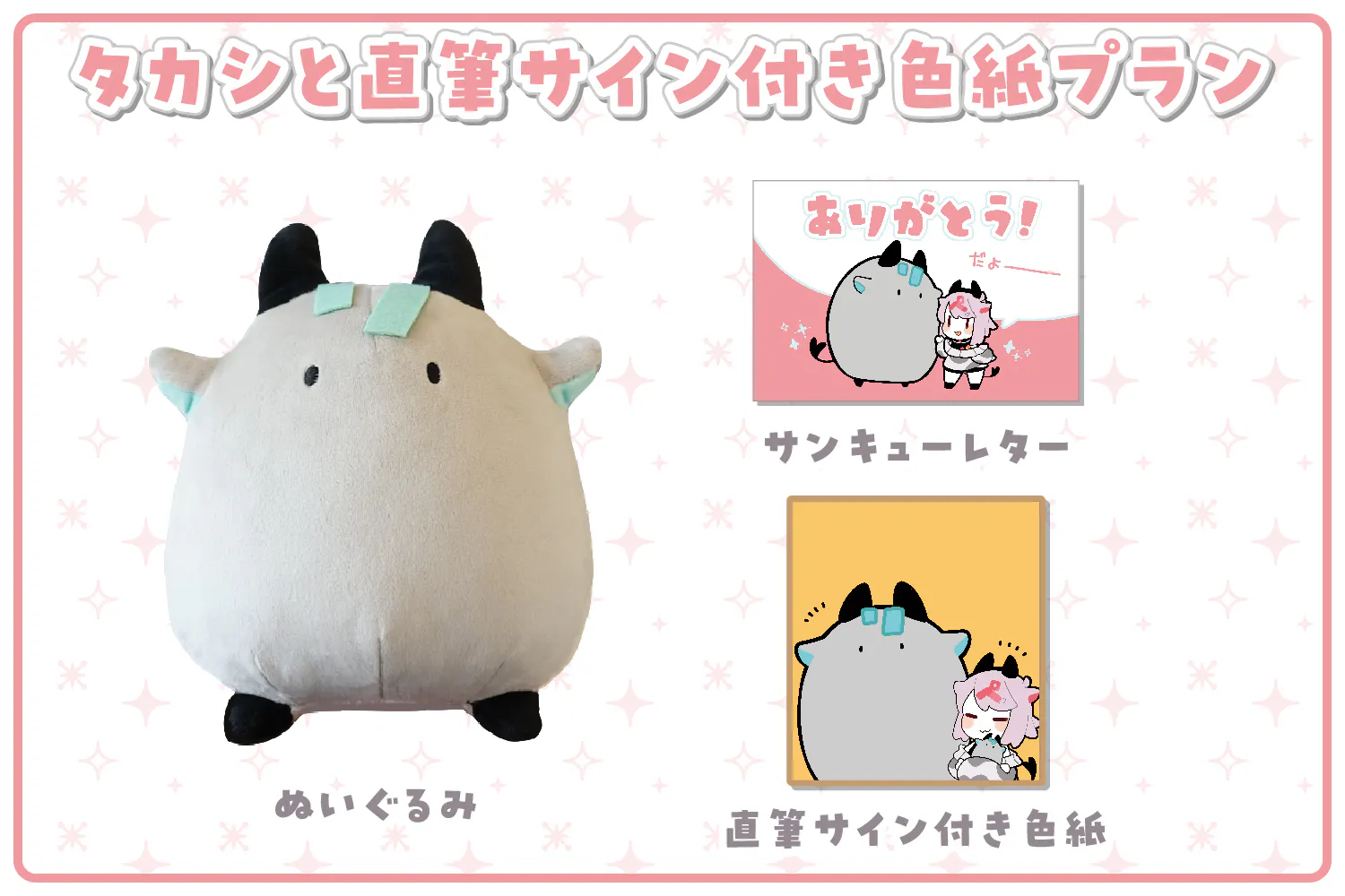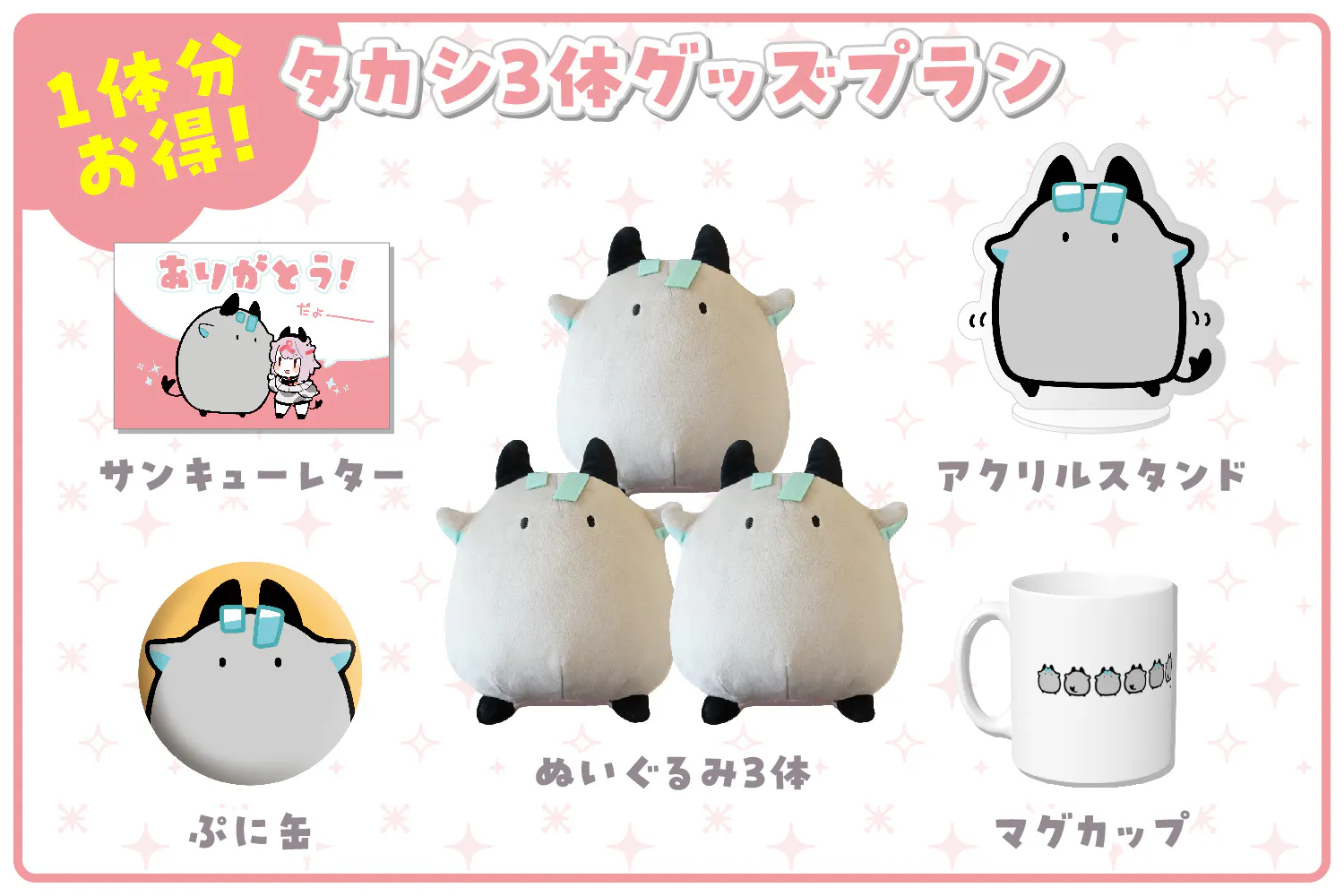 ▲タカシぬいぐるみ3体とグッズがセットのプラン!