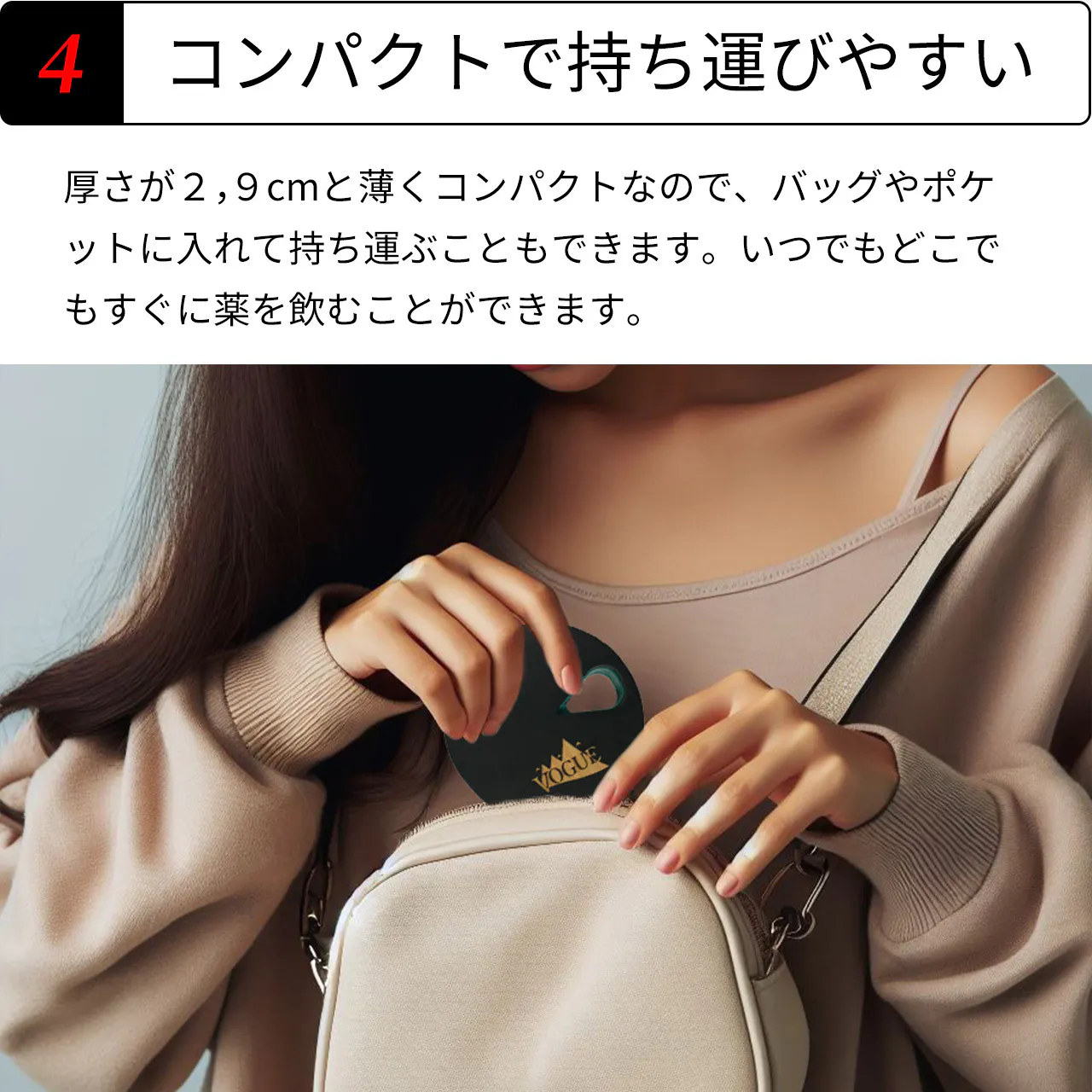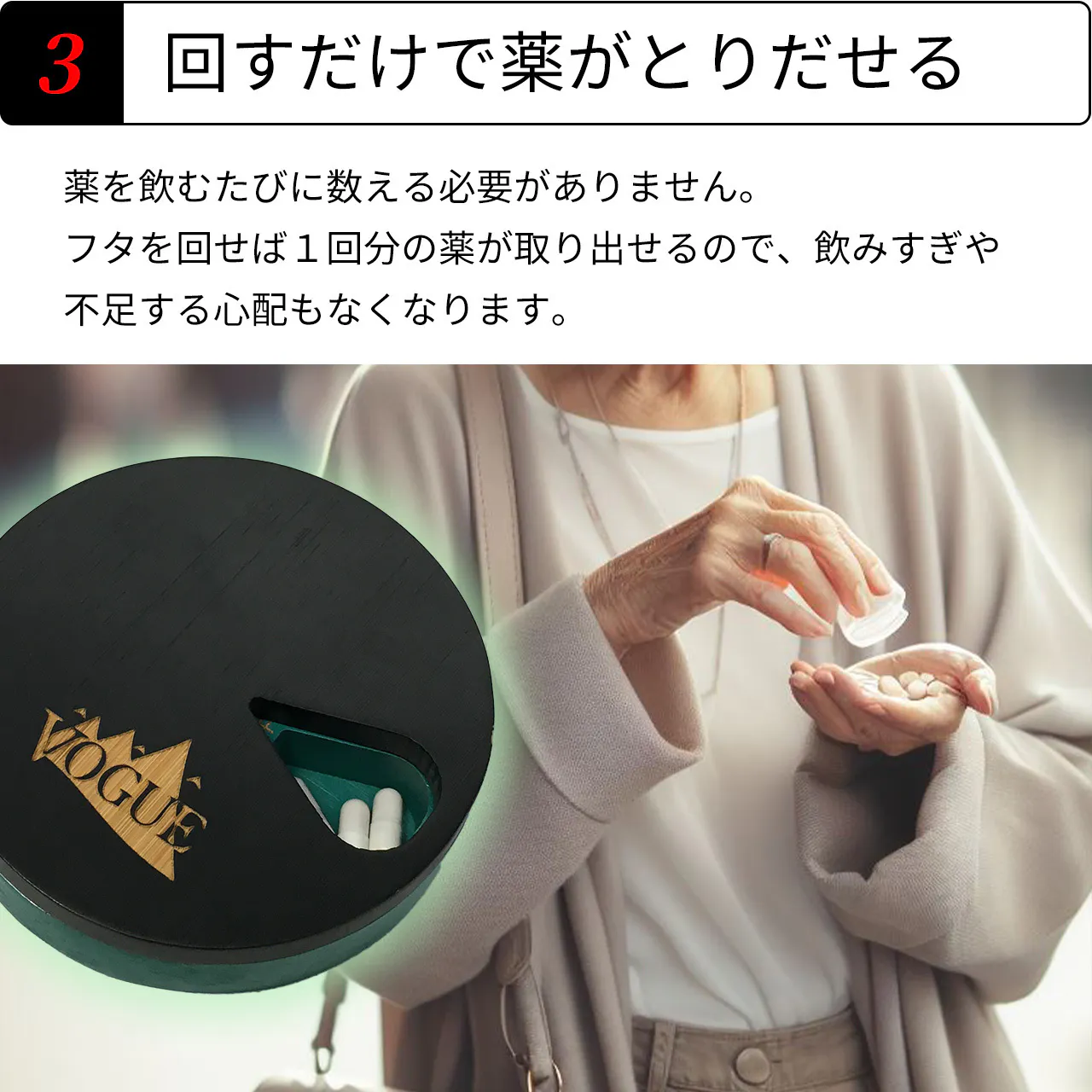 - 2.フタの開け閉めの必要がなく、回すだけで薬が取り出せるので使い勝手がよく薬の数え間違いもなくなる