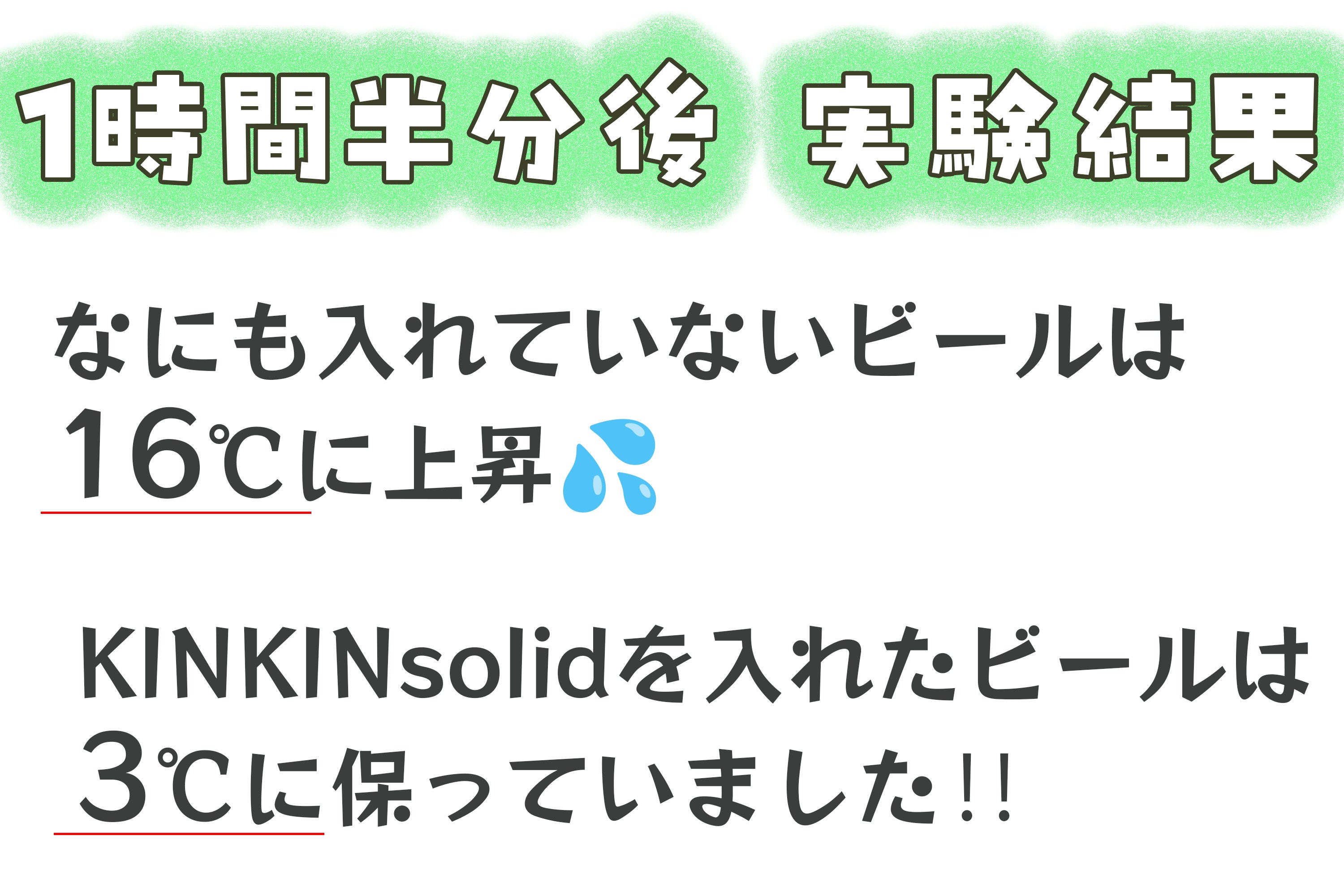 屋内の実験では、なにも入れていないビールは入れてすぐ10℃であるのに対して、KINKINsolidを入れたビールは1℃を計測し、