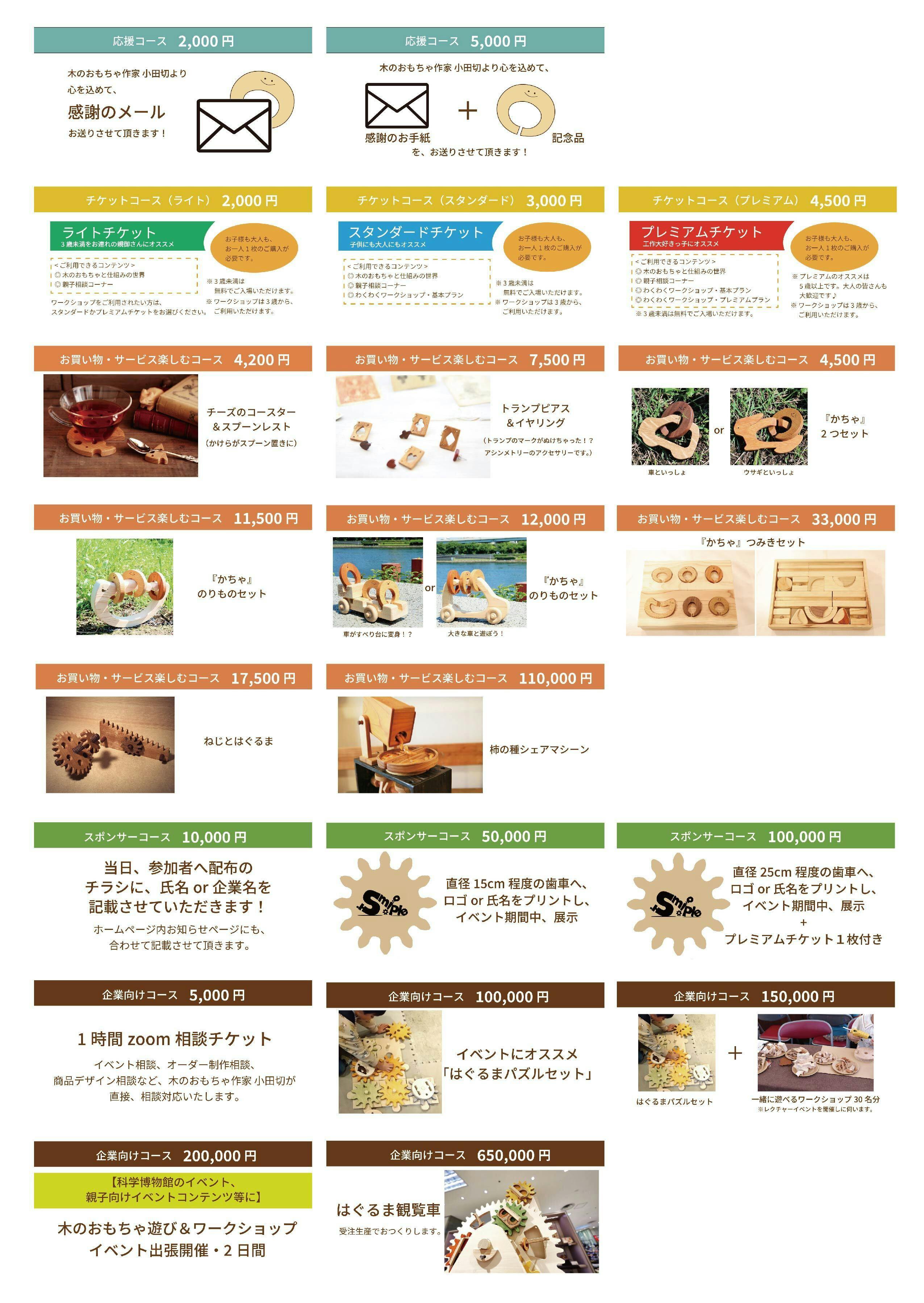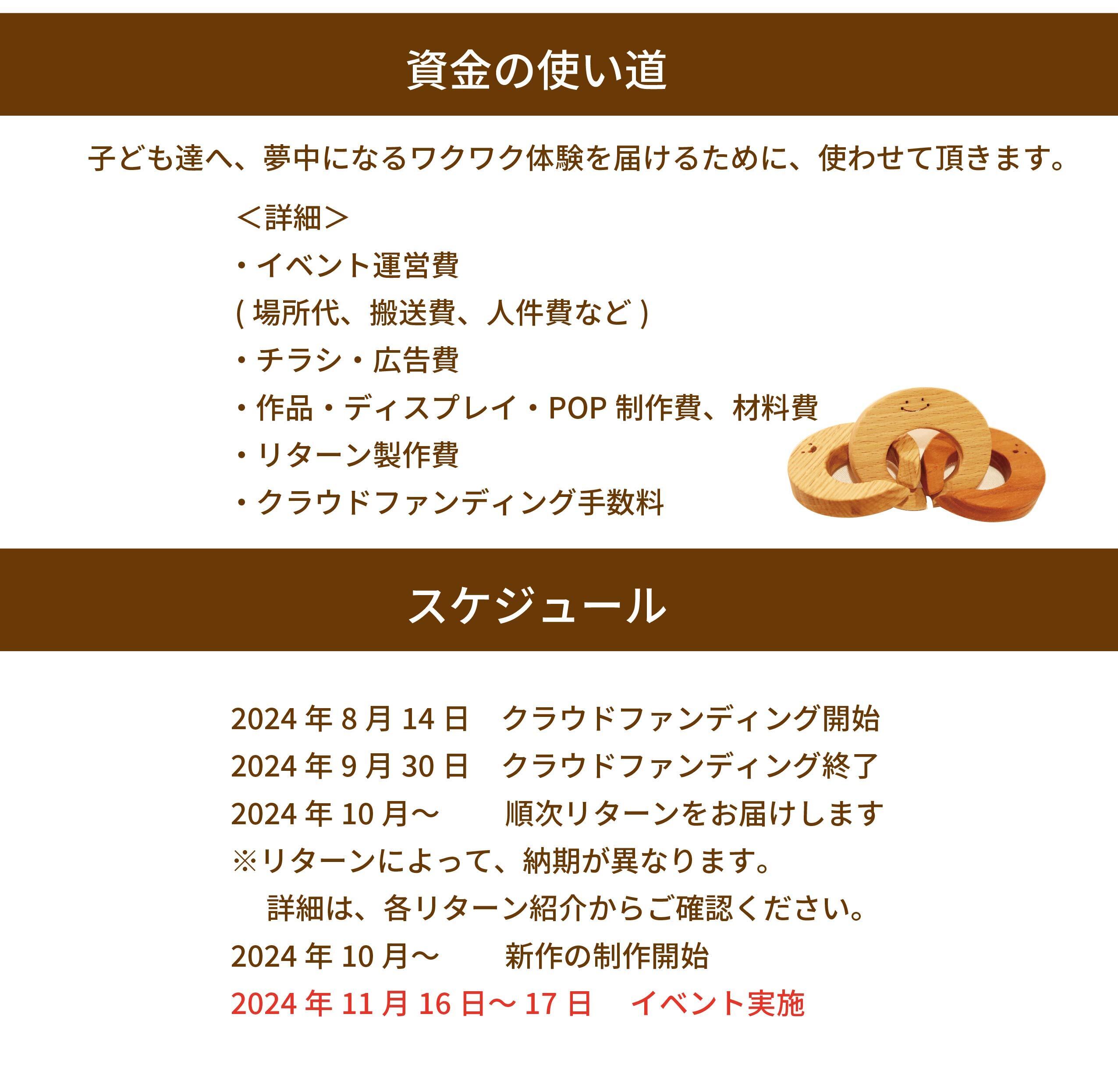 2024/10/15 22:55こんばんは!プロジェクト実行者、木のおもちゃ作家の小田切です(^^ゞ11月16日~17日に国立ふたば幼稚園で開催予定の、本プロジェクトイベントをブラッシュアップしましたのでお知らせです。基本情報や内容は一緒ですが、入場料について変更しています。入場は無料とし、中でワークショップなど利用される際に、お支払い頂く形へ変更しています。(少しややこしかったので、見直しした経緯です(^^;)合わせて、イベントタイトルやビジュアルもリニューアルしています(^^)/ご参加には、お申込みが必要になりますので、下記リンクよりお申込みください。https://docs.google.com/forms/d/e/1FAIpQLSfEOO84u36xoa6tT1Qp2ONejcHqm3V2xTRN4uBT1JEkfkzQrA/viewform?usp=pp_url詳細については、下記ホームページにもアップしていますので、改めてご覧頂けると嬉しいです(^^♪https://odagiriyuka.smiple.jp/news/kunitati_workshop_2024/※スポンサーコースにご支援くださった皆様の、企業名等も掲載させていただきました。☆本イベントに向けて、新作もすすめております。『かちゃ』と遊べる恐竜スライダーを設計中です。(あと1か月、間に合うか。。(^^; 頑張ります!!) もっと見る