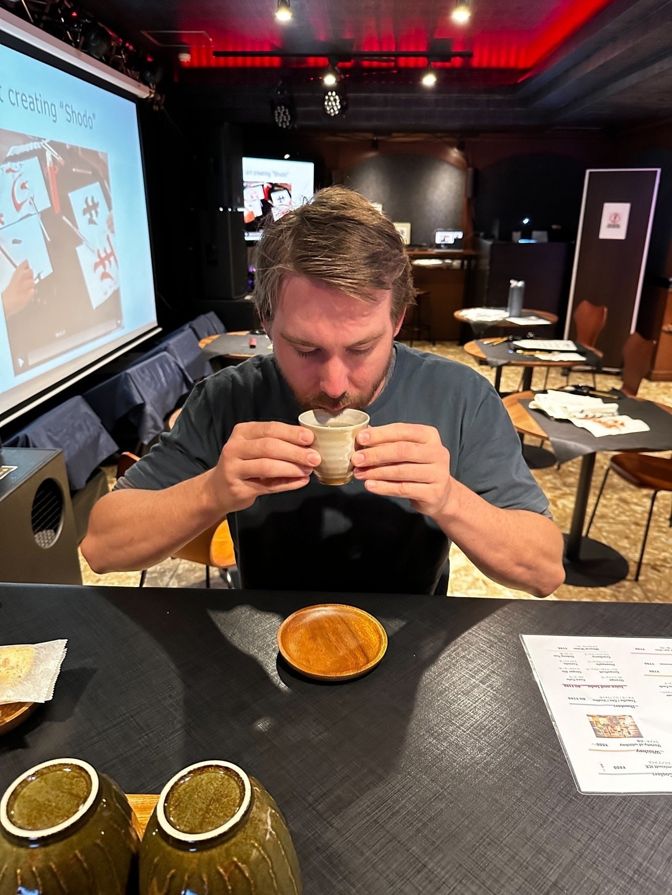 書道体験を終えたお客様と⽇本茶と和菓⼦をいただきながら