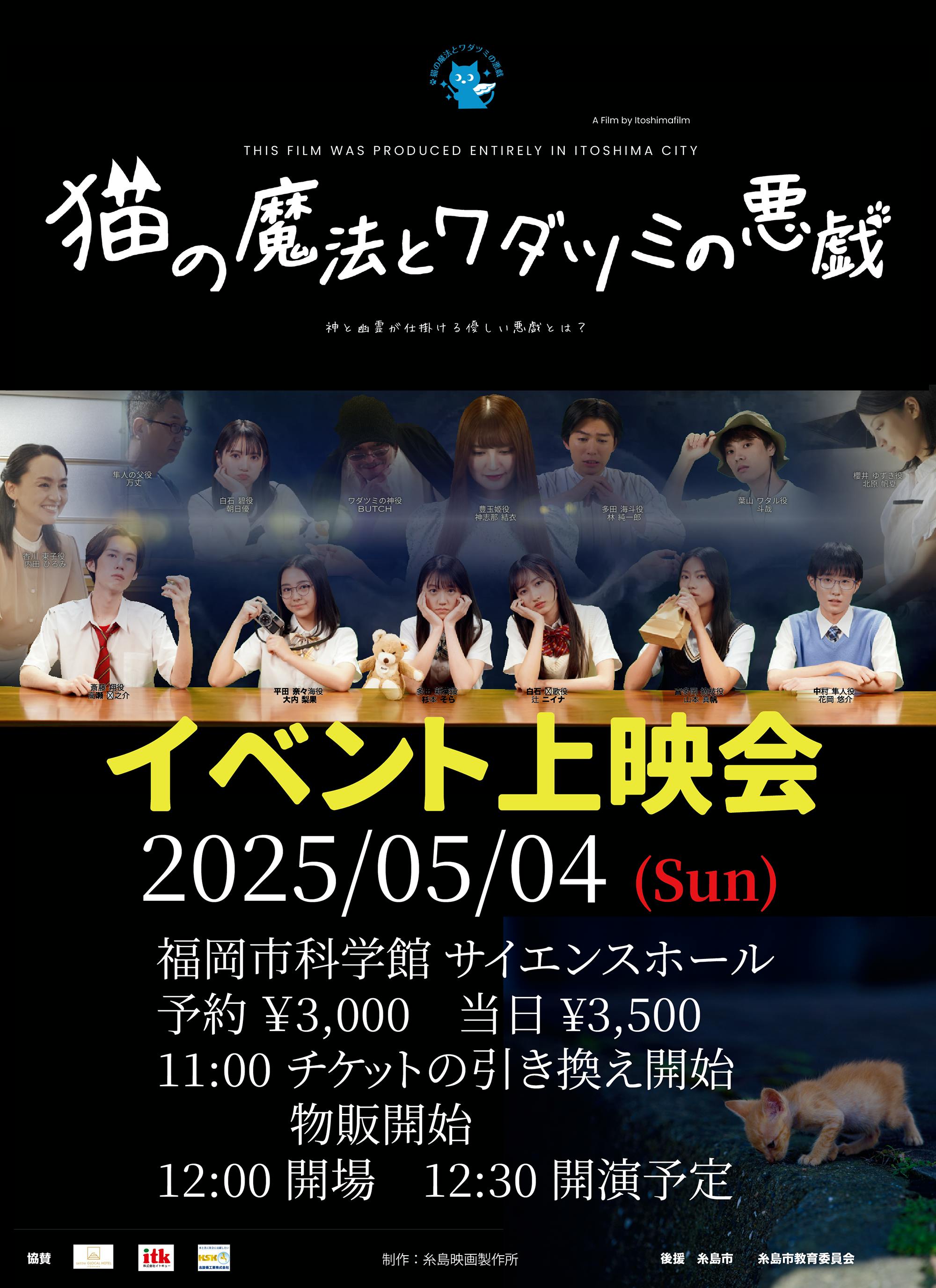 2025/03/08 10:00皆様にご支援いただいた、糸島映画「猫の魔法とワダツミの悪戯」の福岡市でのイベント上映会が決定しました。映画本編の上映と濱洋一監督と出演者*とのトーク、劇中歌アーティスト*によるライブを調整しています。開催は、2025年5月4日(日祝)みどりの日。会場は、福岡市科学館サイエンスホール(福岡市営地下鉄七隈線「六本松駅」上)です。当日は、11:00からサイエンスホール前ロビーにて物販と紙チケットへの引き換え(先着順)を開始します。サイエンスホール開場時のご入場は、ご予約時の番号順となります。関係者席以外は、全席自由席となります。12:00 サイエンスホール開場。 12:30 イベント開演予定です。事前予約で、大人は¥3,000。小学生〜大学生は¥1,000。未就学児は無料です。未就学児・小学生・中学生は、保護者の同伴が必要です。入場者数に余裕がある場合は、当日券¥3,500を受付にて販売します。* 事前予約は、TIGETにて受付中です。 → https://tiget.net/events/381876 ご予約をお待ちしております。* 登壇予定の出演者、劇中歌アーティストは、現在調整中です。 もっと見る