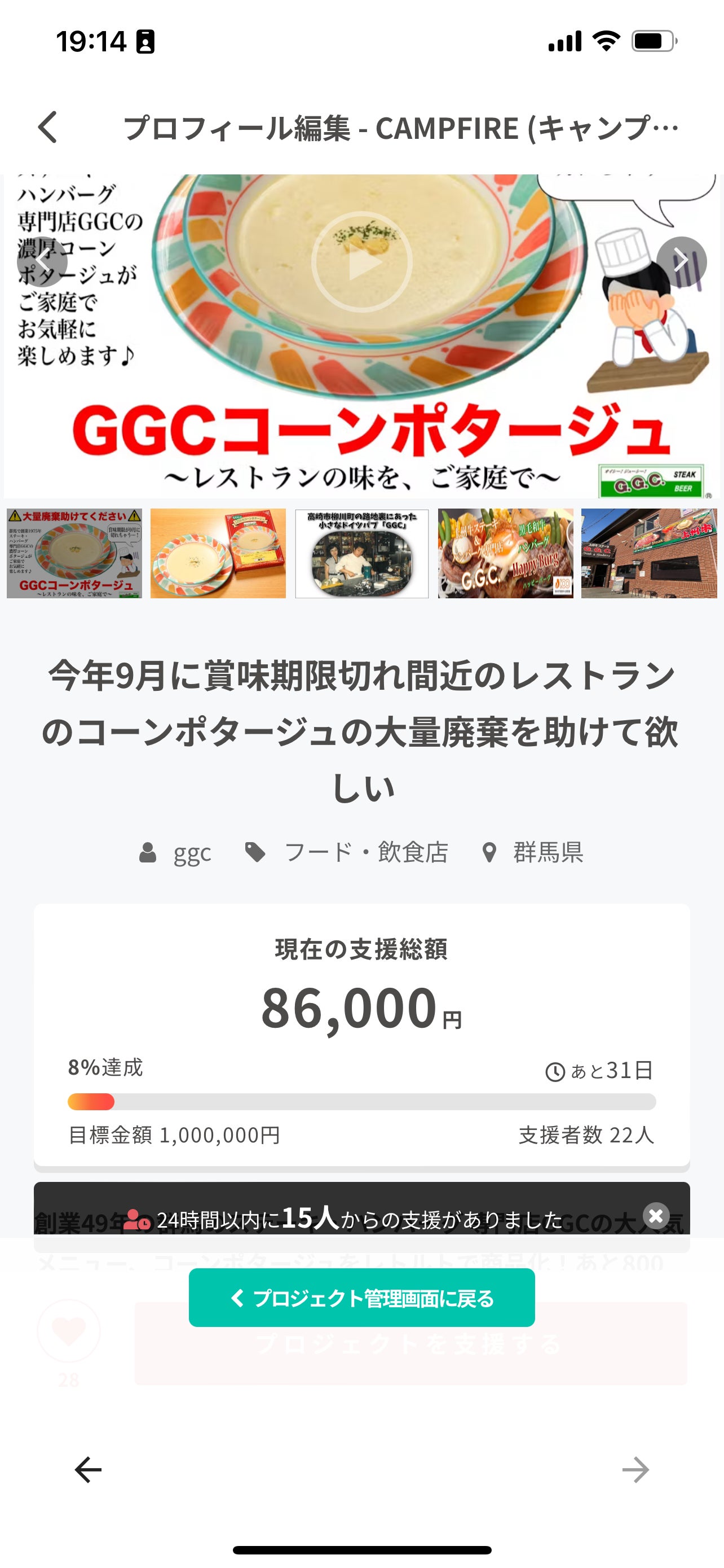 2024/07/02 23:31こんばんは!株式会社GGCの福島です。本日も追加のご支援を頂きました…!!本当に、ありがとうございます。まさかこんなに多くの方からご支援を頂けるなんて思わず( ; ; )感謝の気持ちでいっぱいです。群馬県のステーキ・ハンバーグ 専門店GGCは、1975年に私の祖父母が創業し、現在は父が代表です。当時は高崎の繁華街、柳川町にある小さなドイツパブでした。フランチャイズとして譲り受けた祖父母が、生きていくために、家族のために、なんでもやろう!とお客様が喜ぶ料理を作り続けた結果、ドイツパブからステーキ・ハンバーグ 専門店となり、今があります。父の代で高崎・前橋に5店舗を展開しました。自分は3代目として事業継承するべく、日々現場で奮闘しています。その中でも、このコーンポタージュは、GGCの創業当時から人気があるお客様にとっても、家族にとっても、思い出のある大切なメニューの一つです。この、こゆーい、ドロッドロの、濃厚な味が人気の秘密です。幼い頃は、このコーンポタージュにご飯を混ぜて、離乳食として食べていました。今でも、たまにまかないでコンポタご飯を食べています٩( 'ω' )وスタッフに教えたところ、ハマる子が続出しました笑是非みなさんも、商品が届いたら、コンポタご飯試してみてくださいね♪今後ともよろしくお願いいたします。株式会社GGC 福島 もっと見る今日は嬬恋村キャベツマラソンに出店しました!