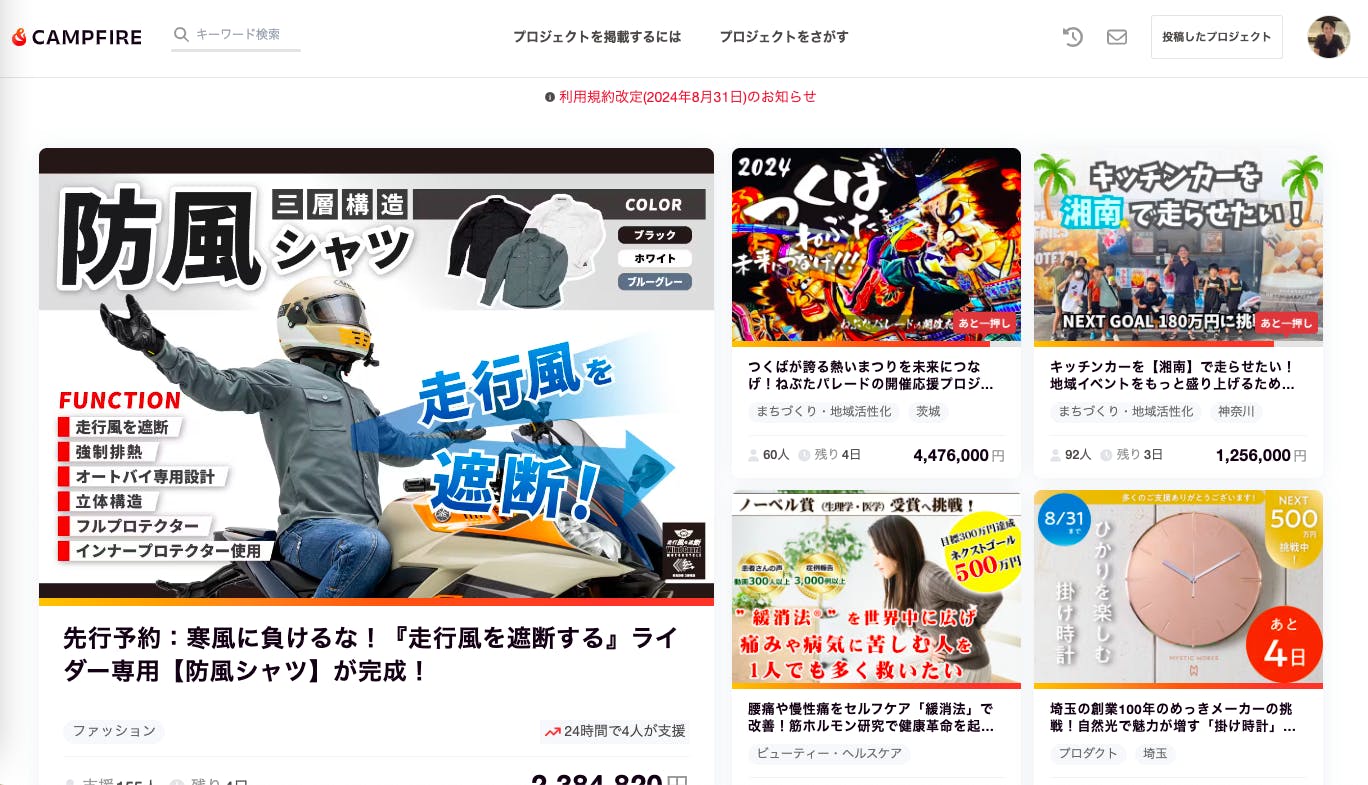 CAMPFIREのトップページに掲載されています。大変光栄です。