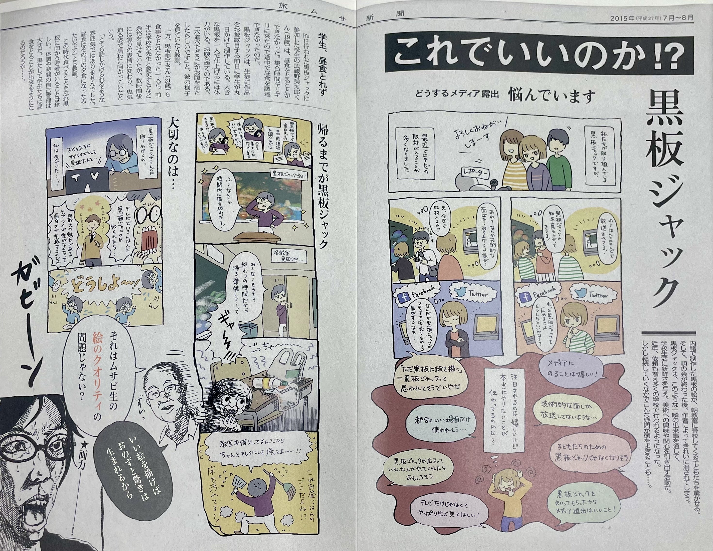 黒板ジャックは旅するムサビの企画の中で学生が考え出したユニークな取り組みだ。黒板は学校で授業に使用し落書きはしてはならない。しかし、表現したい者たちにとっては、それは大きなキャンバスである。日常に在るあたりまえを美術の視点から捉えてみると、全く異なる魅力的な存在に映るのである。日曜日、合法的に学校に忍び込み、児童生徒に気づかれないように黒板一面にチョークで絵を描く。月曜になにも知らずに登校してきた児童生徒は、突然現れた黒板一面の作品を見て、驚き、戸惑う。そして、全教室に描かれているこの企みに気づき、友だちと教室を巡り始める。月曜の朝から学校全体が騒然となる。しかしその騒ぎも朝の会まで。 1時間目の授業が始まる前に作者の手で綺麗に黒板が消されていく。そして何事も無かったかのように1時間目の授業が始まっていく。美術が日常生活に入り込むことで、日常生活が楽しくなったり、身の回りの生活に目を向けさせ、さりげない面白さや美しさに気付いたり、注意深く観察するようになっていく。淡々と繰り返される日常にリズムを与え、生活にうるおいを与えてくれる。日常と非日常、夢と現実、 生と死。人間は常に相反する世界を抱え込み生きている。美術はその異なる世界をつなぐメディアとして存在し、我々に生きる意味を考えさせてくれるのである。