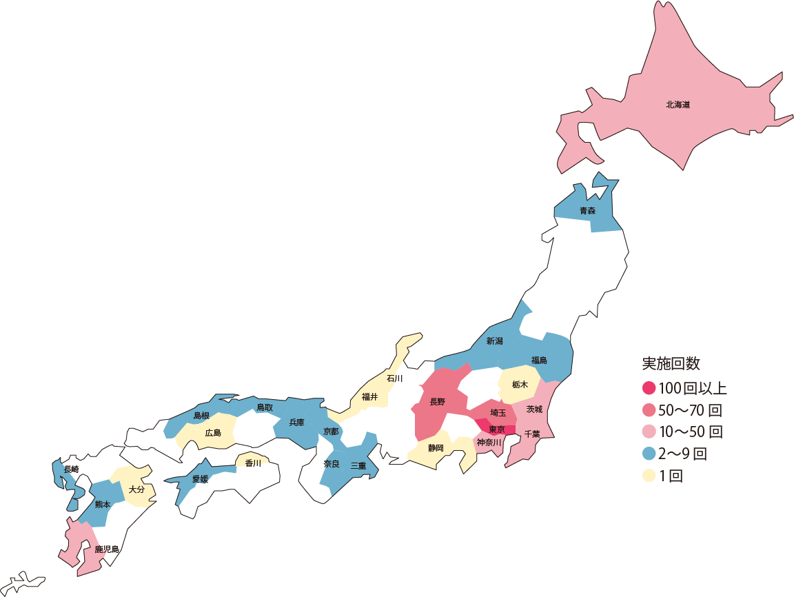 現在は、年間で30企画ほどのプロジェクトが同時並行で行われており、17年間での実施数の合計は、25 都道府県と海外で 515 回を超えました。