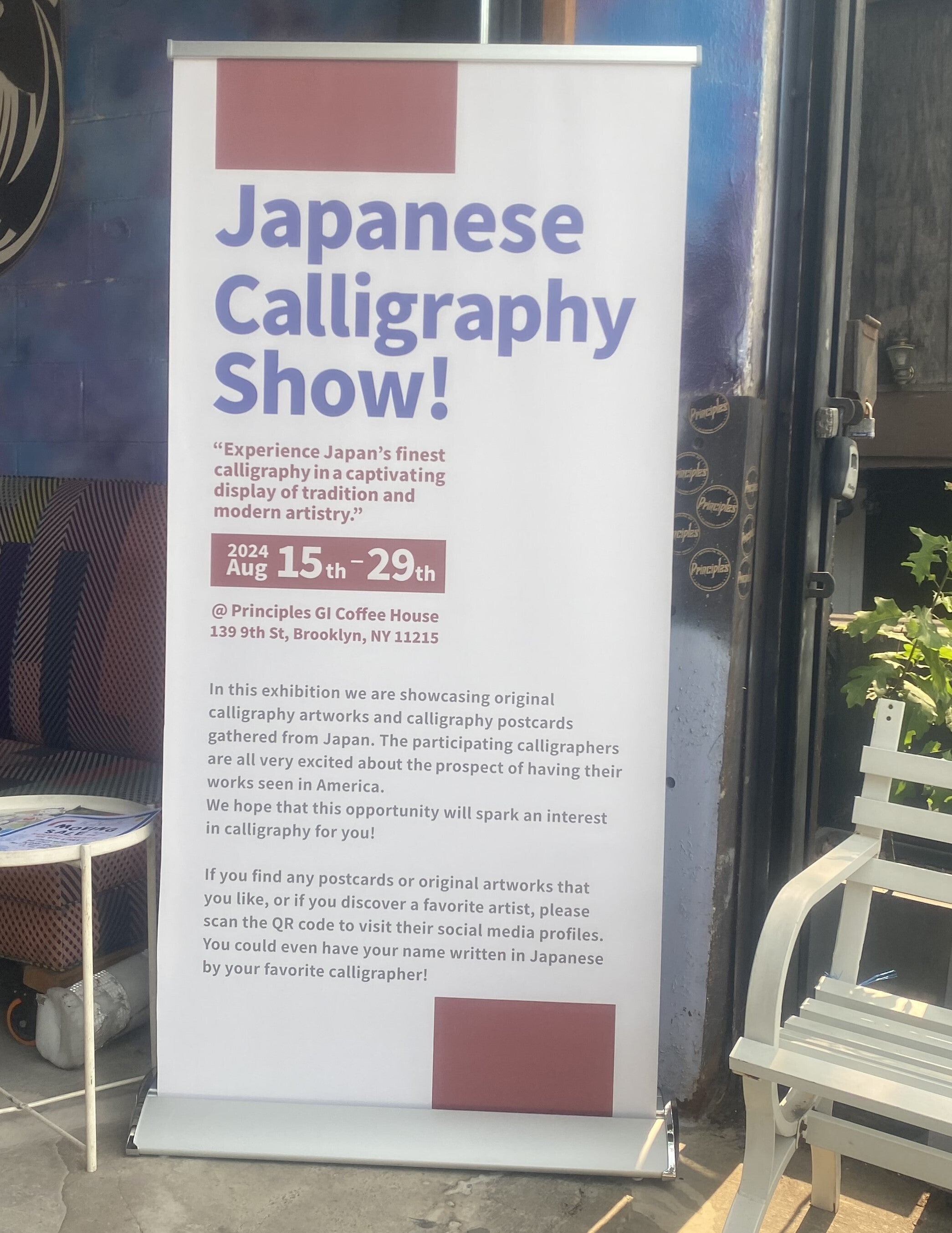 みなさん、こんにちは!ニューヨークはブルックリンに滞在しております越俊幸です。みなさまのご支援を受けて今回ニューヨークへとたどり着くことができました。投宿しているホテルから徒歩5分の書道展会場に実際に足を運び、自身の作品が展示している様子をちゃんと確認できました。そのご報告です。まずこちらが展示内容の全概要となります。およそ40作品の展示となりますかね。どの作品も日本から海を渡って、書の世界の素晴らしさを伝えたいという思いでいっぱいです。こちらが私の今回の展示作品です。前回6月の参加時には漢字4文字での出展でしたが、今回は百人一首で挑みました。自己紹介文も作品紹介文も私が事務局に提示した内容そのままです。英語ができてよかった…(^^ゞ途中で現地書道展サポートメンバーの女性と遭遇し、トントン拍子に話を進めていただいて8/28-29の在廊と簡単なブース展示許可をいただきました。このサポートメンバーである日本人女性がとても私の訪米を感動していただきまして、私が日本から持参したこの水書き書道ツールを感動しながら体験していただきました。また今回の展示作品をざっと見まわしてみると、日本のかな文字、特に百人一首に関する展示が多く出展されていると感じました。私と同じようなお考えの方が多いのですね。紫式部大人気です。もうあとは最終日を残すのみとなりました。現地時間10:00には実際の展示会場に向かいます。楽しい時間が過ごせたらいいなと思います。引き続き最後までみなさんの温かいご支援をお待ちしております。なにとぞよろしくお願いいたします。