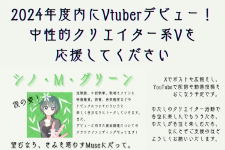 この度、2024年度中にVtuberとしてデビューすることを目指し、各位のご支援をお願いしたくこのプロジェクトを立ち上げました。