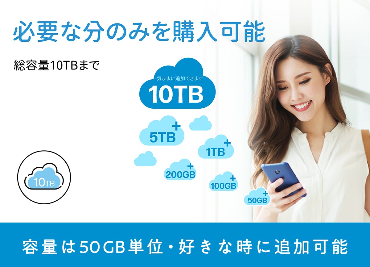 50GBの一括払い購入プランからスタートし、容量が必要なタイミングで追加すればOKです。最大10TBの膨大なデータもデバイスに保存する必要はありません。すべてクラウドでまとめて保存します。