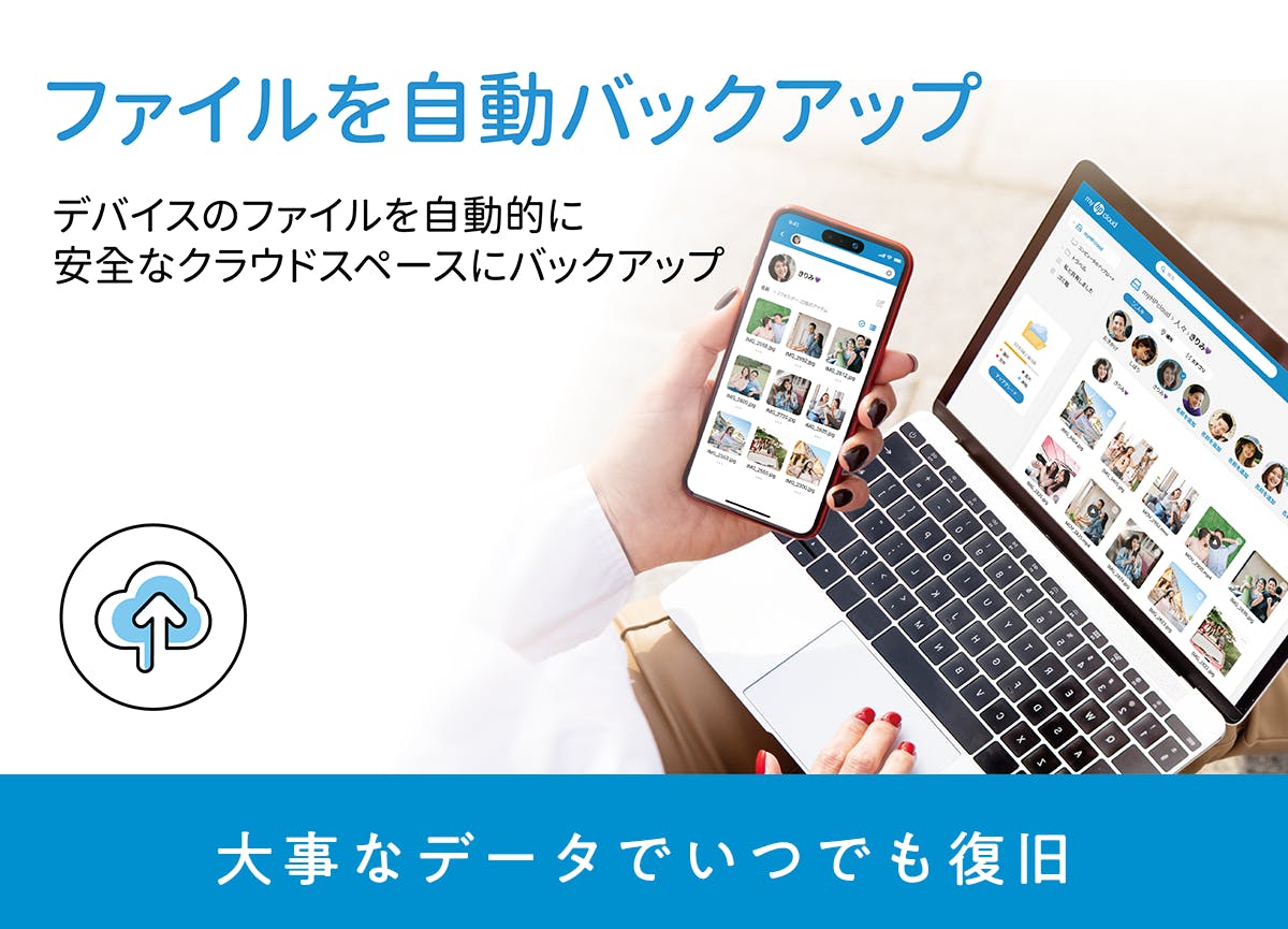 myHPcloudは間違えてパソコン上の元データを削除しても、一度クラウドに保存したデータは残り続ける自動バックアップ機能を備えています。デバイスにデータを復元したい時は、クラウドからダウンロードするだけで簡単にデータを復旧できます。