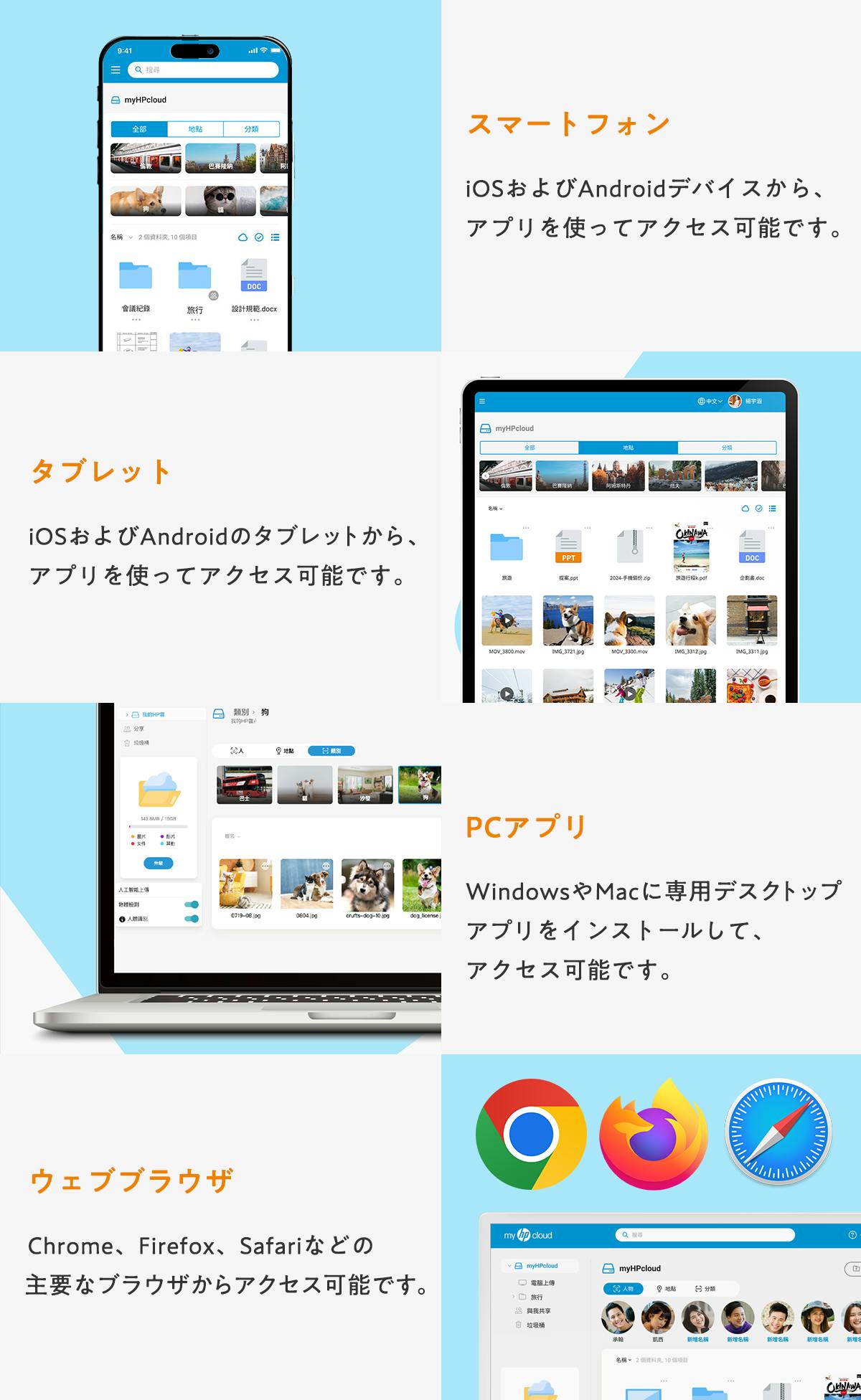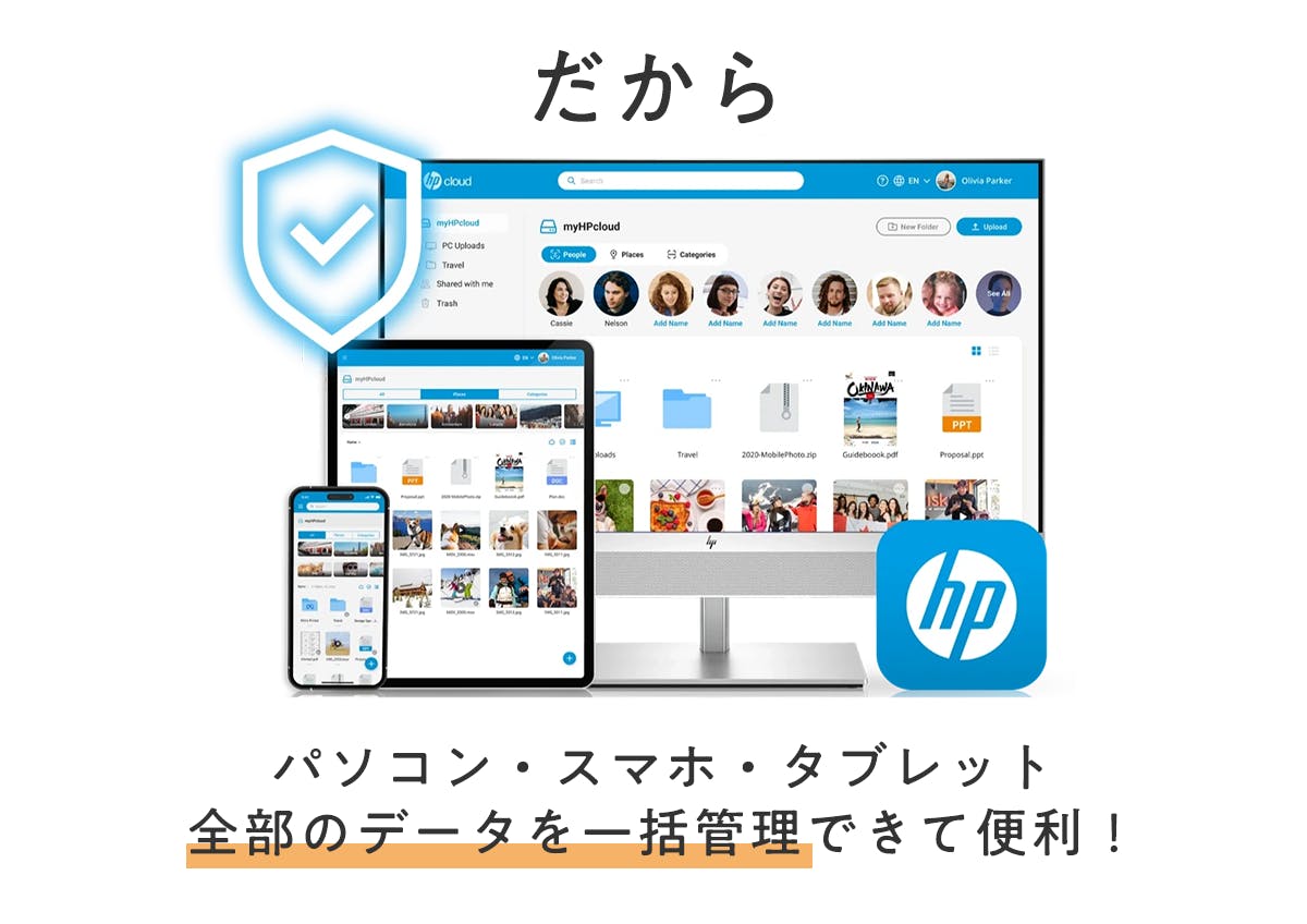 myHPcloudは、世界中のどこにいても、写真や仕事で利用するデータに簡単にアクセス・共有できる最先端技術を搭載したクラウドストレージサービスです。(※ネット接続環境下)