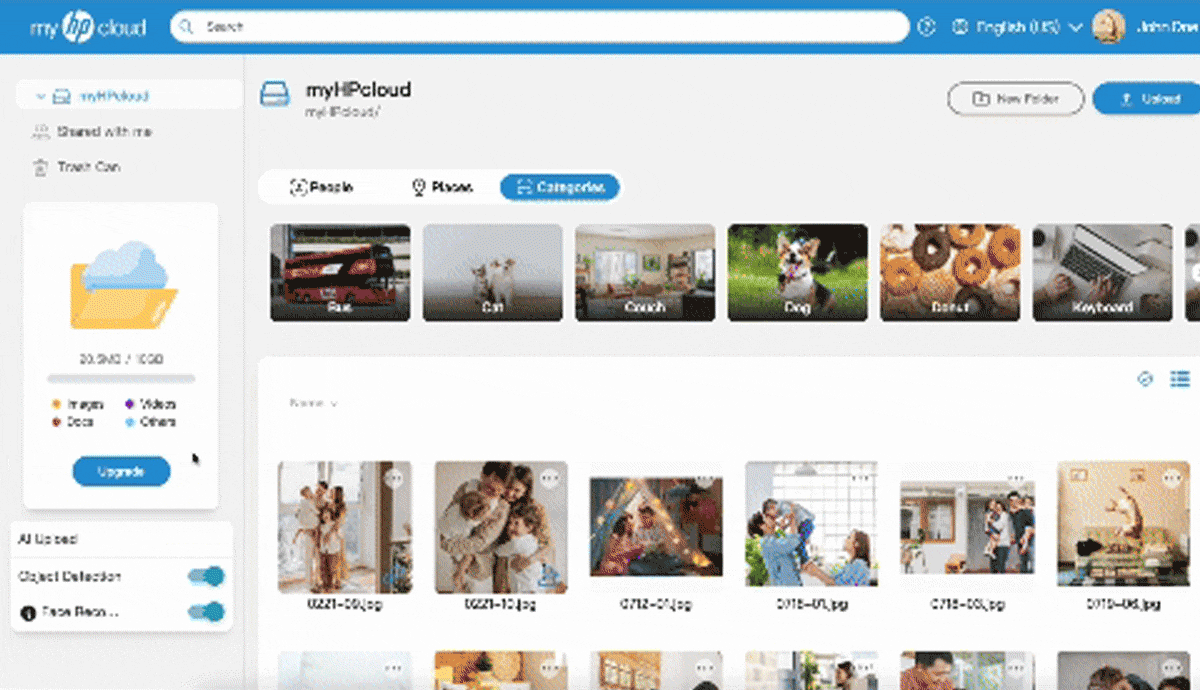 myHPcloud上で高度なアルゴリズムが働くことにより、類似したオブジェクトを自動でグループ化。新しい写真をmyHPcloudへ追加するたびにアルバムが自動で更新され、ペット、風景、建物などが瞬時に整理されます。