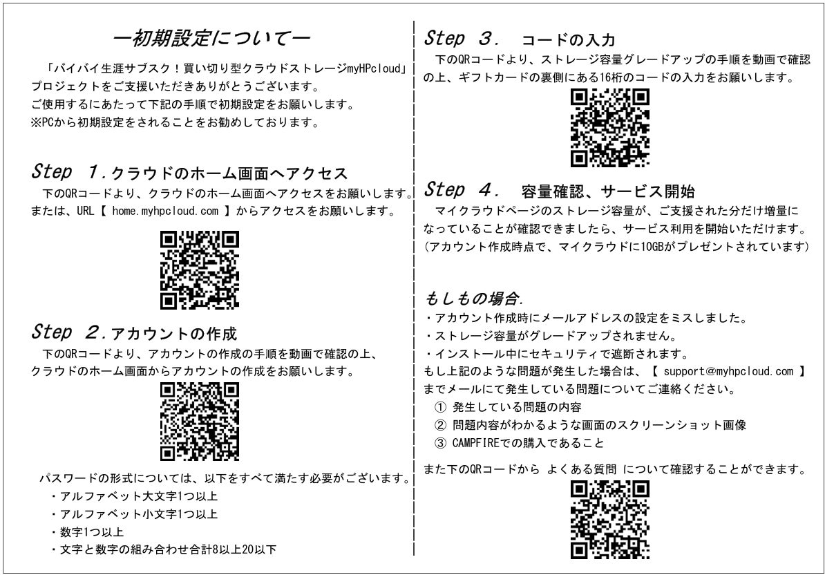 ご支援の皆様皆様のご支援・ご協力感謝いたします!■リターン発送完了のご報告をさせていただきます。3月10日でサポーターの皆さまへのゆうパケット(郵便配達)にての発送が完了いたしました。郵便ポスト等の状況確認も改めてお願い申し上げます。※交通機関などの状況により、お届け時期が前後する可能性もございますので、ご了承ください。リターンであるギフトカード到着後、同封しています「初期設定について」をご確認いただき、確認をお願い致します。なお、不在等による返品が生じた際の返品手数料、および再発送をご希望される場合の再発送手数料(送料含む)は、ご支援者様にご負担いただくことになりますので、あらかじめご了承ください。お届けまでもうしばらくお待ちくださいませ!!引き続き、「買い切り型クラウドストレージmyHPcloud」プロジェクトを宜しくお願い致します。プロジェクトチーム一同