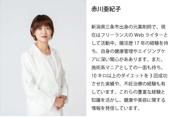 健康や美容の発信をしているWEBライターの赤川亜紀子さんに今回は、次世代のエイジングケア※成分として注目されている「5-デアザフラビン(TND1128)」を配合したサプリメント「DEAZA PLUS+」を試していただきました。