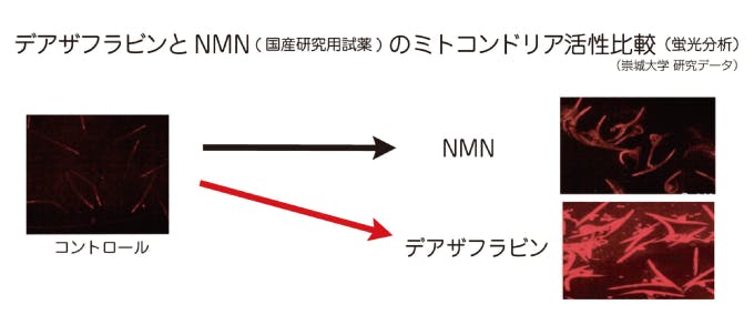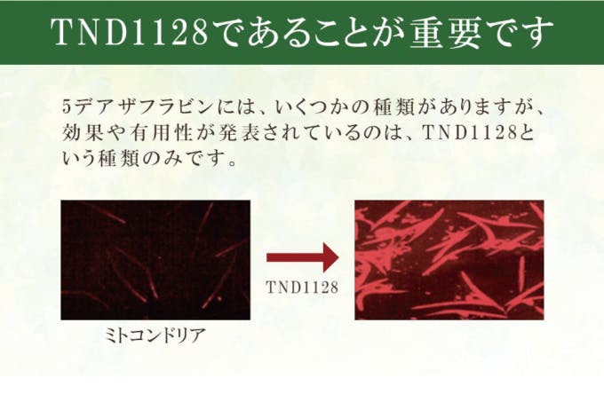 「5-デアザフラビン(TND1128)は、東京の大学の教授らが研究開発を進めている次世代のエイジングケア(年齢に応じたケア)サプリメントです。」