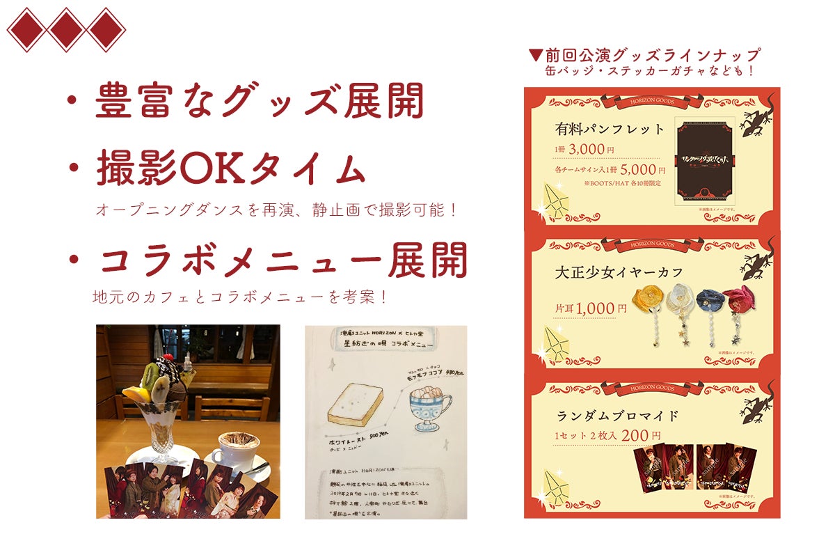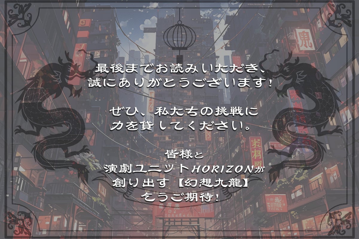 2024/10/20 15:11皆様おひさしぶりです!活動報告を見つけてくださりありがとうございます。先日、最後のリターン「派閥アクスタ」の発送完了をもちまして、本プロジェクトが終了いたしました。7月からここまでお付き合いいただいた皆様、ありがとうございました!今回のプロジェクトは「静岡に体験型・没入型演劇を根付かせたい!」という思いで発足しました。もちろん、そんな多種多様な芸術やパフォーマンスが、これからの静岡で尊重されていくといいな、という気持ちもあります。ですがそれ以上に、このプロジェクトや『monoclone』という公演で、皆様とのご縁と応援を数えきれないほどいただきました。何にも代えがたい贈り物をありがとうございました。*・。*・。*・。*・。*・。*・。*・。演劇ユニットHORIZONは、12月に2年ぶりのオリジナルシリーズを、ストレートプレイでお届けします。『monoclone』とは全く違った雰囲気と作品になると思います。ぜひこれからのHORIZONも、引き続き気にかけてくださると嬉しいですし、私たちも皆様と出会える機会を大切に育んでいきます。改めまして、「ライブハウスを九龍城に! 静岡に体験型・没入型演劇を根付かせたい!」のプロジェクトに関わってくださった皆様、ありがとうございました!!・✴︎・** ┈┈┈┈┈┈┈┈┈┈┈┈┈┈┈┈┈┈**今後の演劇ユニットHORIZON** ┈┈┈┈┈┈┈┈┈┈┈┈┈┈┈┈┈┈**2024年12月21日(土)・22日(日)第20回公演『星宿る灯』会場:SOUND SHOWER ark 清水【North Stage】21日(土)14:30〜22日(日)17:00〜✶短編「きらきら星変奏曲」✶フラグメント「ただいま」✶長編「ユピテルの欺瞞」✼••┈┈┈┈••✼【South Stage】21日(土)18:30〜22日(日)13:00〜✶短編「ひだまりの縁側」✶フラグメント「おかえり」✶長編「明日、ライラックの花が咲いたら」✼••┈┈┈┈••✼<チケット>S席(最前)4,000円A席(前方)3,500円B席(中央)3,000円C席(後方)2,500円+ドリンク代600円予約フォームはこちら※ 【North Stage】【South Stage】ともに、短編・フラグメント上演後休憩あり。全体上演時間は約120分予定。・・━━・・━━・・━━・・━━・・━━・・━━・・2025年7月5日(土)・6日(日)第21回公演『±Conclusion』会場:LIVE ROXY SHIZUOKA”観客の投票によってエンディングが変化する、ダブルエンディングストーリー”<あらすじ>—××は果たされるべきか、否か人体咬傷連続殺人事件。通称、人狼事件。満月の夜に、若い女性が被害に遭う連続殺人事件が起きている。その特徴は「被害者の体が欠損している」こと。刃物による致命傷とは別に、被害者の体が一部、あるいはごっそりと持っていかれているのである。手や足だけに留まらず、内臓や骨も対象になっていることから、「食べられているのでは」という憶測が憶測を呼んだ。満月と獣から連想したのか、巷では「人狼事件」と呼ばれている。強行犯係の刑事だった桂木は、ある事件をきっかけに、表立って取り扱うことのできない特殊な事件を捜査する「特殊犯罪対策係」に異動となる。新しい相棒、望月とともに人狼事件を追うことになった桂木は、唯一の生存者である被害者の少女・水鏡(みかがみ)に話を聴こうとするが、彼女は事件のショックで視力と記憶を失っていた。捜査を進めるにつれ、事件の謎はより深くなっていく。真実に辿り着いたとき、彼らの取った行動は……?・・━━・・━━・・━━・・━━・・━━・・━━・・2025年冬第22回公演『Jaggy』”HORIZONオリジナル時代劇「Roar」シリーズが帰ってくる!”<あらすじ>「人斬り以蔵潜伏との報あり」土佐に移送中の岡田以蔵が逃亡したとの噂が広がる京都。時を同じくして、新選組の隊士が斬られる事件が起きた。新選組隊士の野分と赤島は下手人を探すことになるが、何だか野分の様子がおかしいようで・・・?新選組隊士・野分と赤島を描く「Roar」シリーズ第二弾が早くも登場!市村鉄之助、岡田以蔵も登場する幕末活劇!・・━━・・━━・・━━・・━━・・━━・・━━・・2026年 coming soon… もっと見る