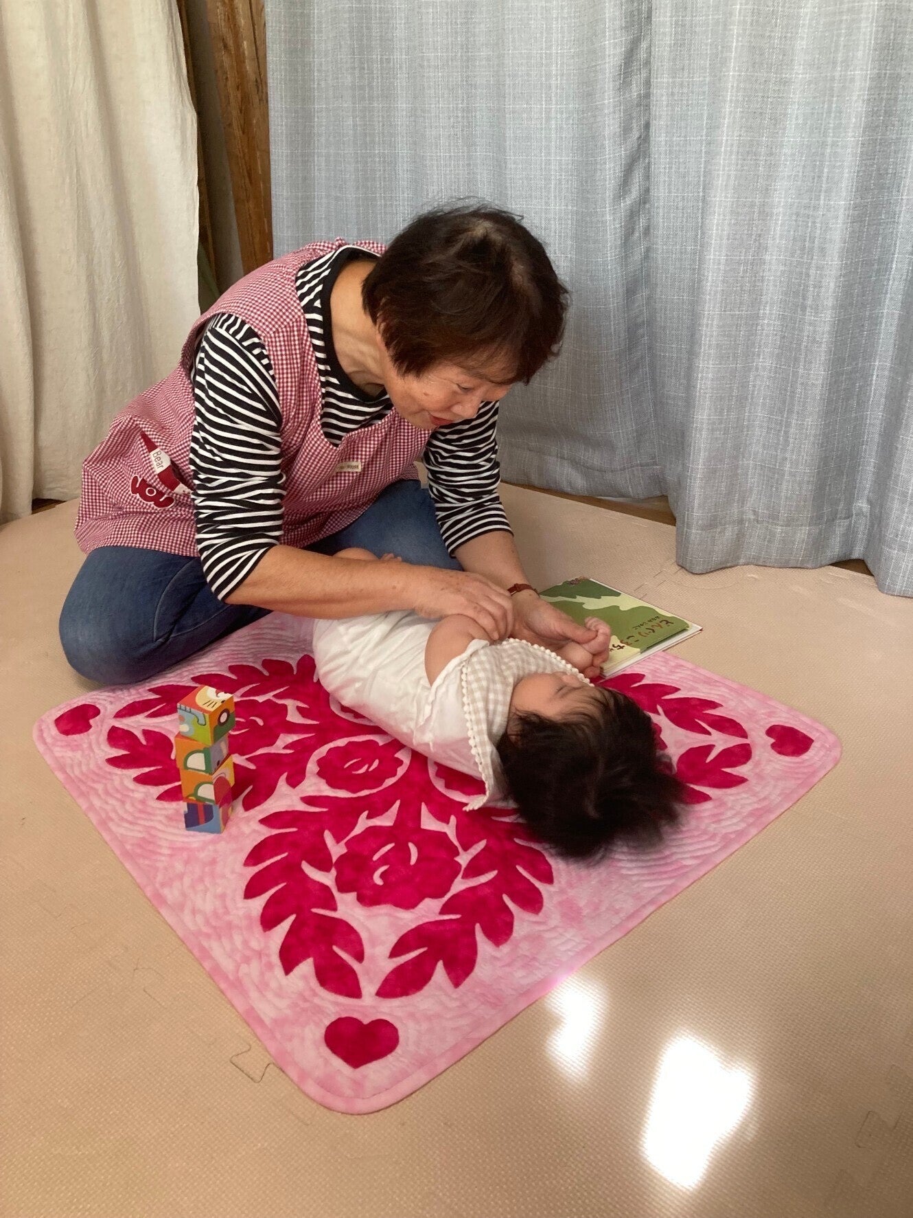 やわらかい風では、わらべ歌を歌ったり、庭に出てお散歩したりと、赤ちゃんとゆったりと関わっています。