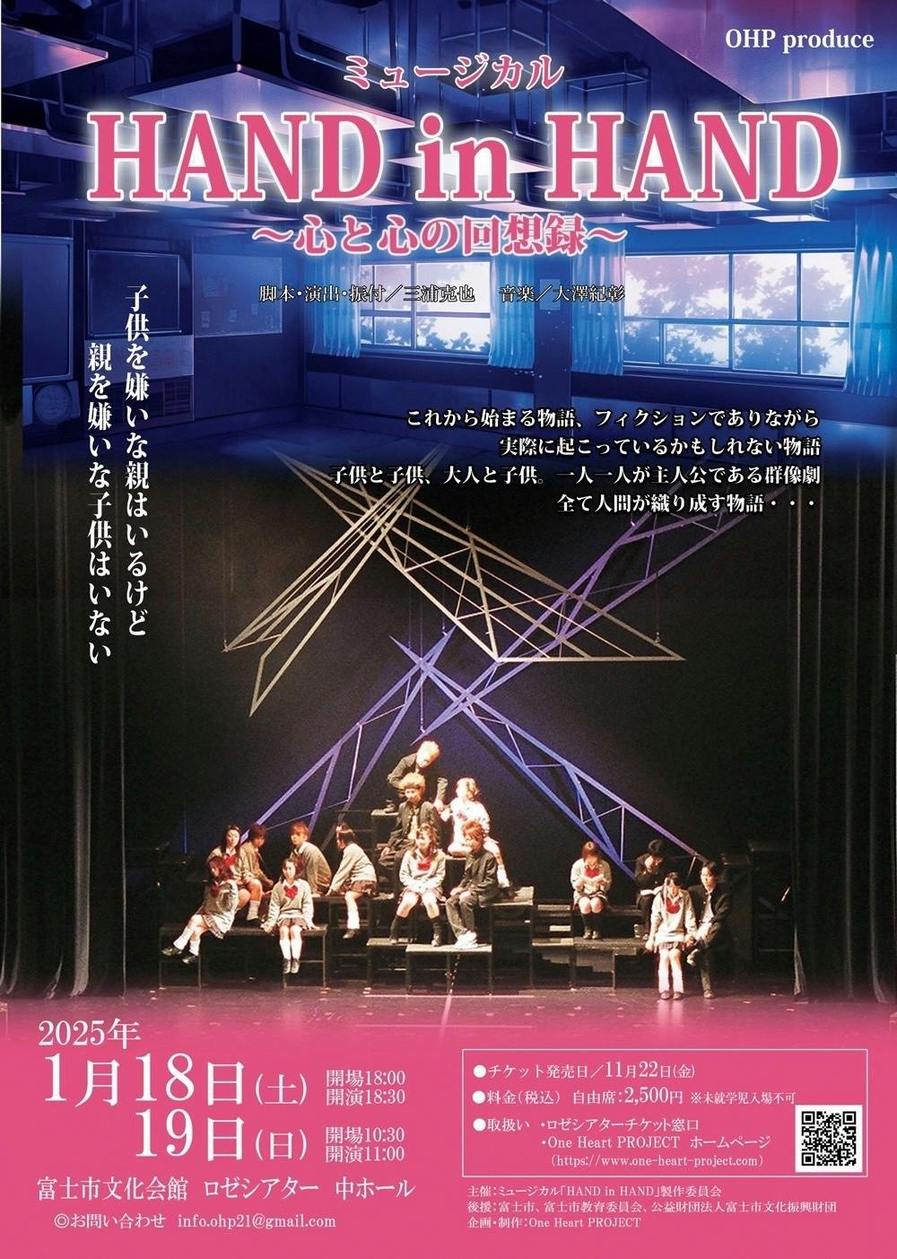 来年1月18.19日に富士市ロゼシアター中ホールにて行うミュージカル「HAND in HAND〜心と心の回想録」のチラシが出来上がりました!!