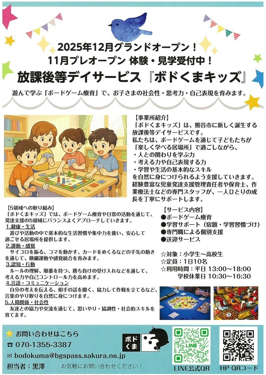 いつも温かいご支援・応援をいただき、誠にありがとうございます。このたび 令和7年12月1日、放課後等デイサービス「ボドくまキッズ」が正式にオープン いたしました。ここまでたどり着けたのは、クラウドファンディングを通じて応援してくださった皆さまのお力添えがあってこそです。心より感謝申し上げます。オープンからまだ数日ではありますが、子どもたちは日々ボードゲームを楽しみ、笑顔が自然と広がる温かな空間が生まれています。また、ボドくまキッズでの日々の様子は、公式HPのブログにて公開しております。ぜひご覧ください。→ HP:https://bgspass.sakura.ne.jp/まずは熊谷での運営をしっかりと軌道に乗せることを大切にしつつ、もし叶うのであれば、将来的には熊谷以外の地域にも少しずつボードゲーム療育を届けられたら嬉しいと考えております。改めまして、このプロジェクトを応援してくださった皆さまに深く御礼申し上げます。今後とも温かく見守っていただけましたら幸いです。