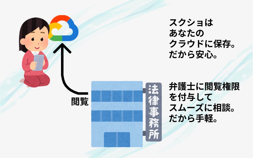スクリーンショットの保管をクラウドでやる理由は3つあります。一つ目の理由は、常に被害者が自由にスクリーンショットを管理できるようにしておきたいからです。二つ目は、スクリーンショットは大事な証拠データですから、常に最新のセキュリティで守られるべきだからです。三つ目は、弁護士との相談を円滑にできるようにしたいからです。クラウドに置いておけば、弁護士にスクリーンショットを渡すためにいちいち印刷する必要も、メール添付して送る必要もありません。弁護士に閲覧権限を付与すれば良いだけです。