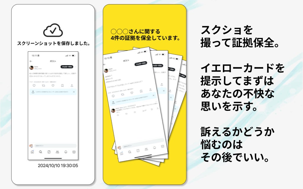 被害者が Fronts を使ってスクリーンショットを撮ると、Fronts は撮影日などの情報とともにこれを保管します。Fronts は、撮り溜めたスクリーンショットに基づいてイエローカード(警告)画像を出力します。この画像は、被害者が攻撃者に対し、不快の意思を表明するために用いるものです。攻撃者の一部はこれを提示するだけで誹謗中傷を止めます。もちろん(Fronts ではなく)自分で撮ったスクリーンショットも利用できます。