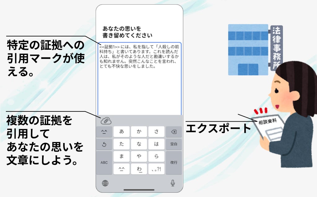 そして Fronts は、そうして溜まった文章を、まとめて、整形し、一つのファイルへエクスポートします。このファイルは、誹謗中傷で受けた被害を弁護士に説明するための相談資料になります。法律相談は口頭ベースで行われるのが通常ですが、その際に相談資料があると、事情の伝達がスムーズに行えるため、被害者と弁護士の双方にとって有意義なのです。