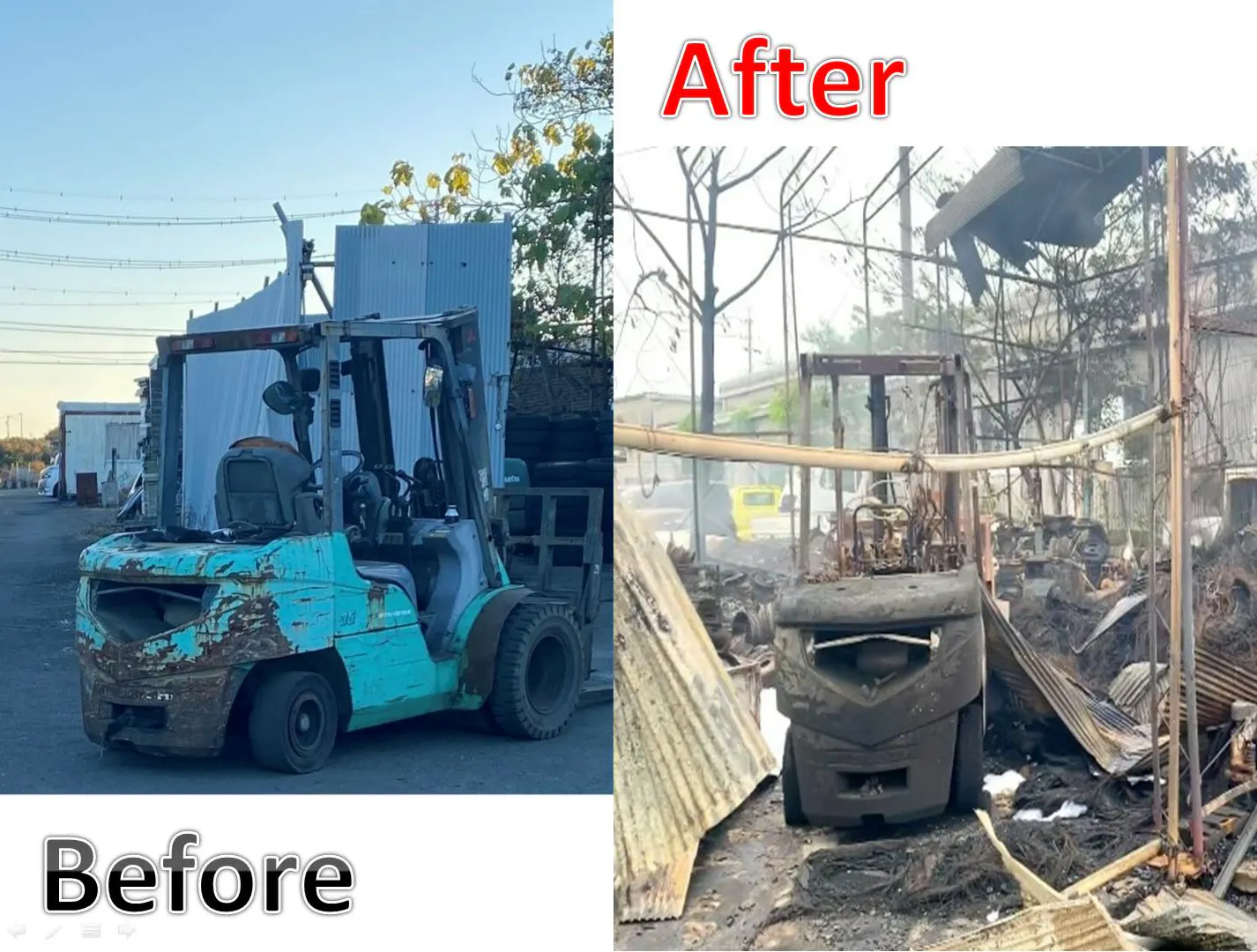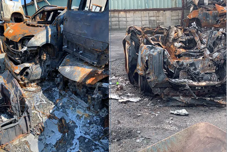 懸命な消火活動をしていただきましたが鎮火までに17時間、一睡のできないまま朝を迎えやっと現場に入ることができました。解体予定だった車両45台+貿易用にあつめていた商品などが灰と鉄くずになっていました。愛用していた20歳のフォークリフトも鉄くずに....