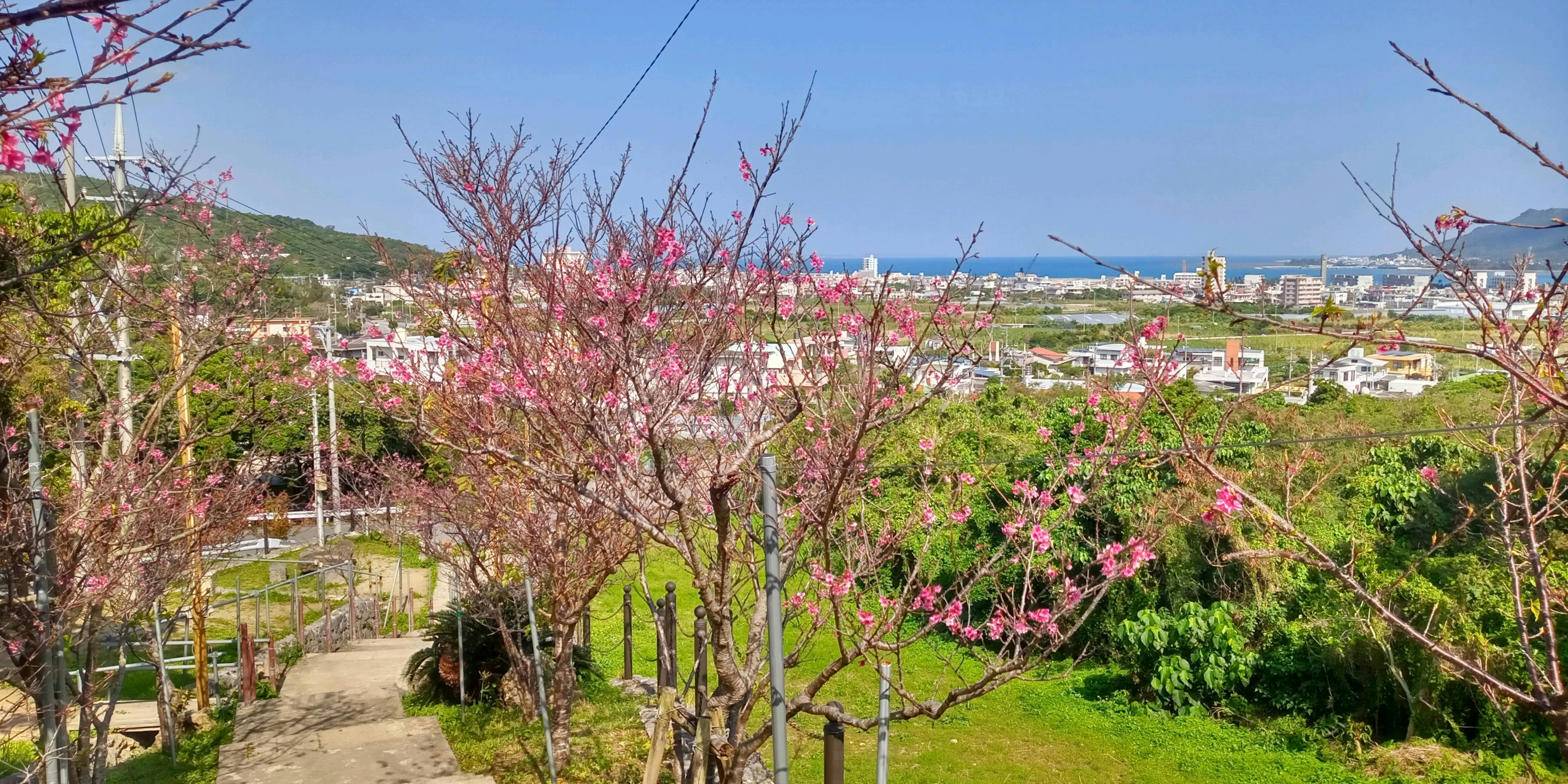 中城湾を望む美ら石坂に咲くひかん桜(1月後半から2月初旬)