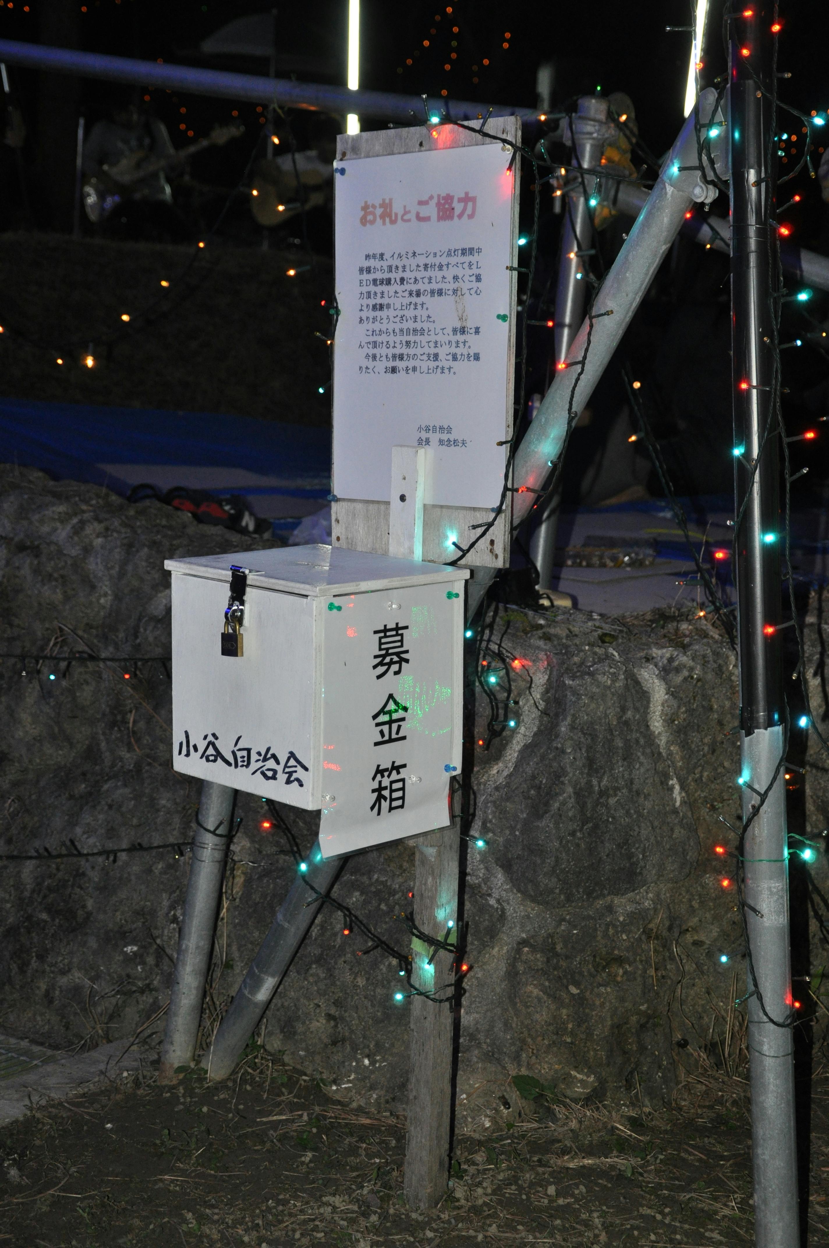 小谷美ら石坂イルミネーションは、集落の人々の世代間交流、皆さんが笑顔になれるプロジェクトを創ろうとの目的で始めました。これまで小谷自治会員のみならず南城市内外の皆様を笑顔にしてきました。 初回点灯より17年経過しイルミネーションの電球が経年劣化で球切れが多く発生し、また機器の故障が多数見受けられるようになりました。これまで自治会の予算と皆様からの支援金で維持をしておりましたが300人程度の小さな自治会ではこれから先、現状維持を行う事が非常に困難な状況に直面しております。子供たちの笑顔を始め、地域の人々、家族、友人、恋人のきずなを育むイルミネーションとしてこれからもずっと継続して行きたい。