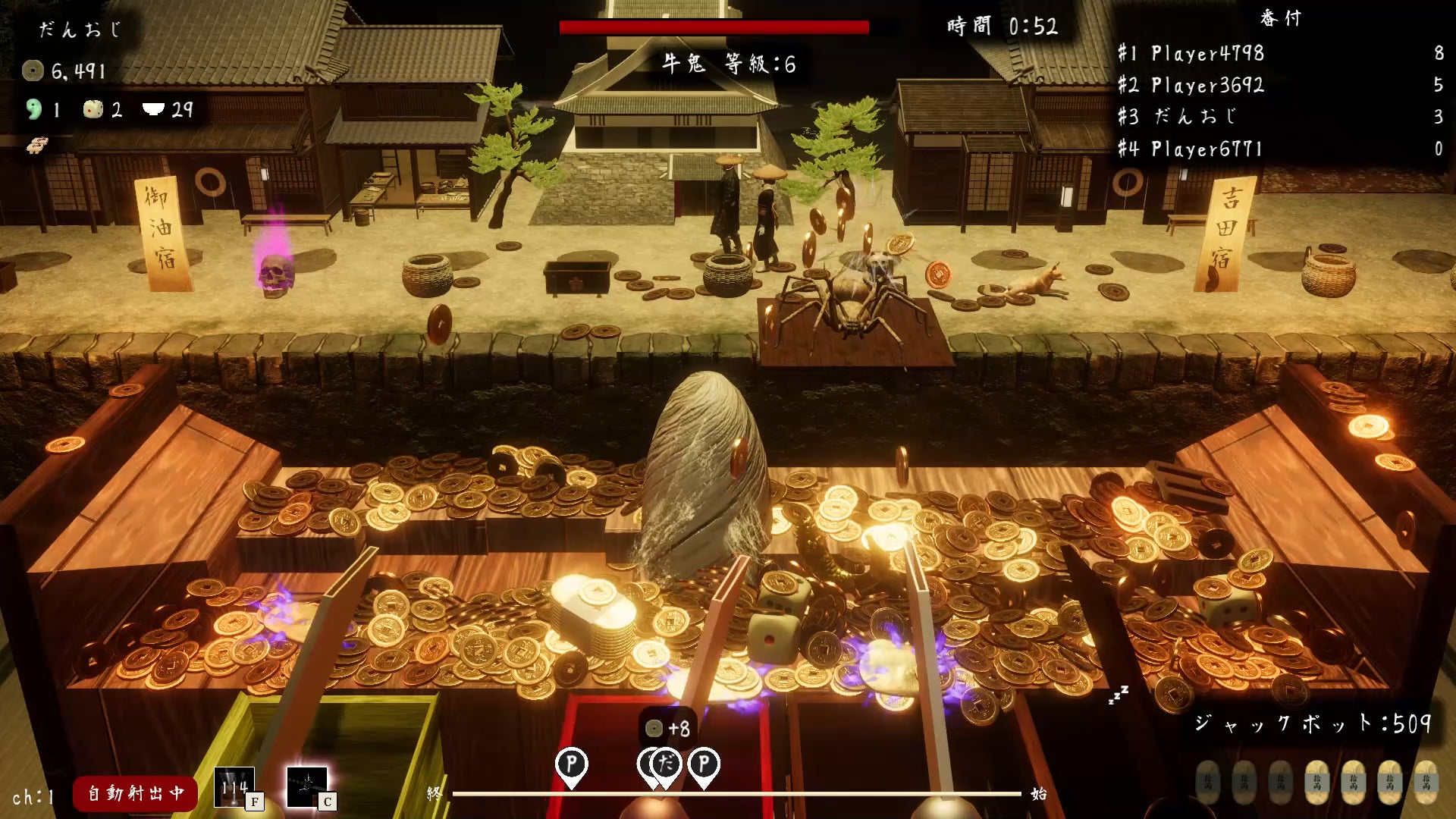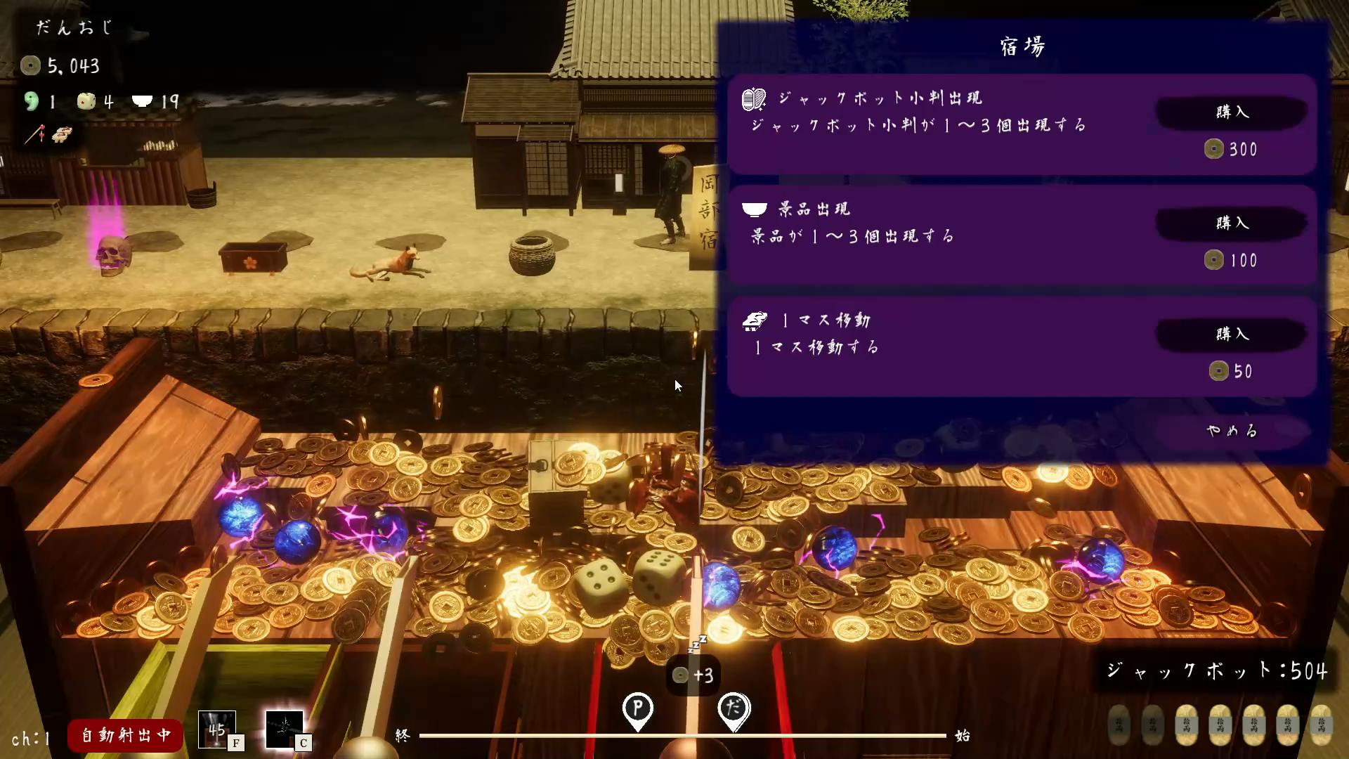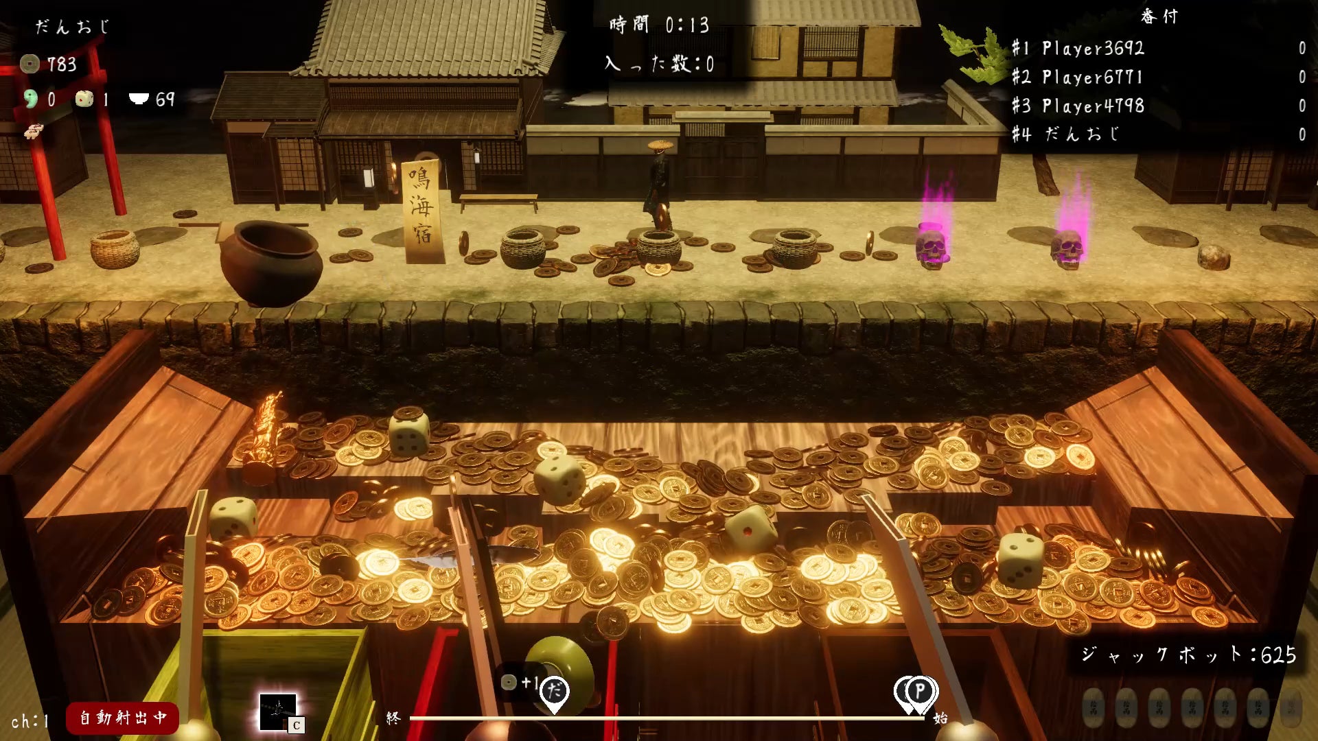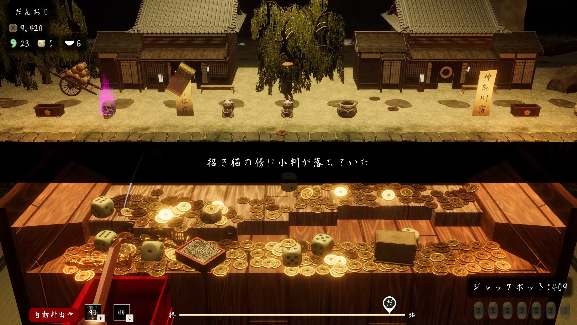 ジャックポット小判を7個貯めるとジャックポットが発生!右下のジャックポットの枚数分の古銭や景品が降り注ぎます。