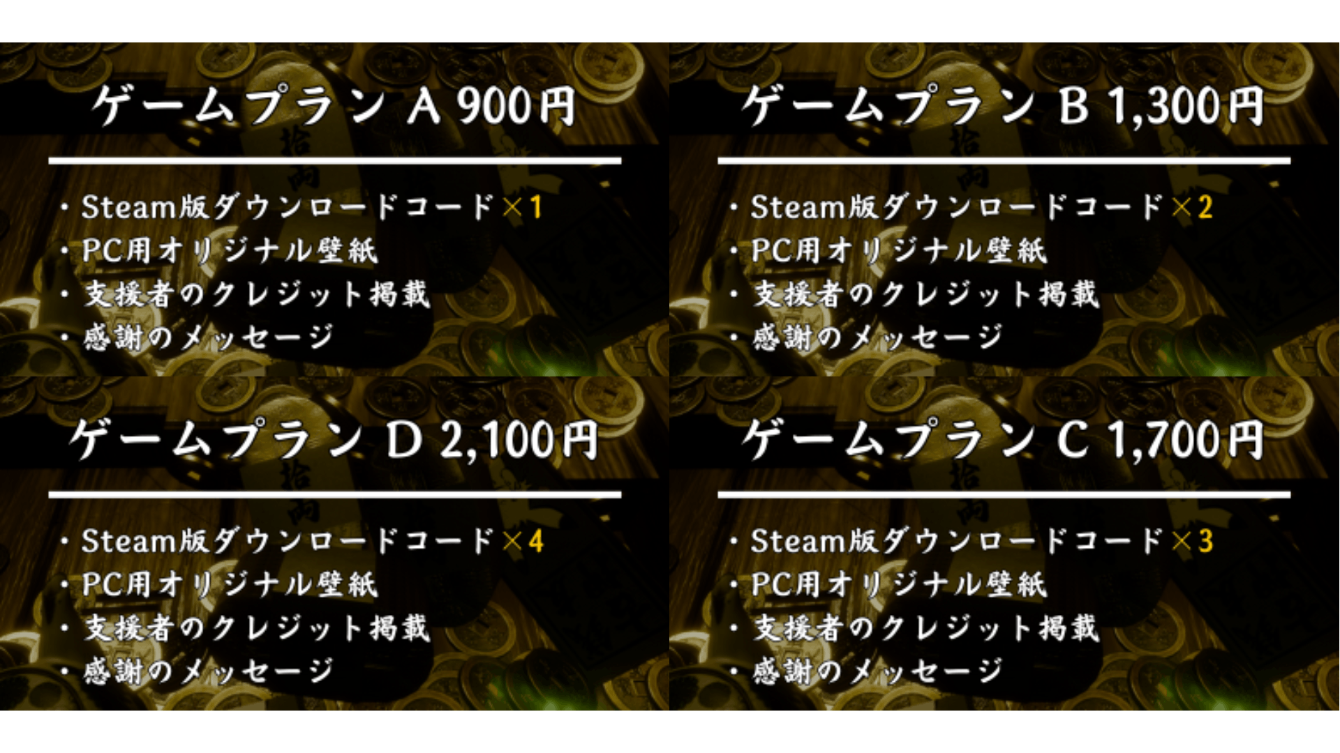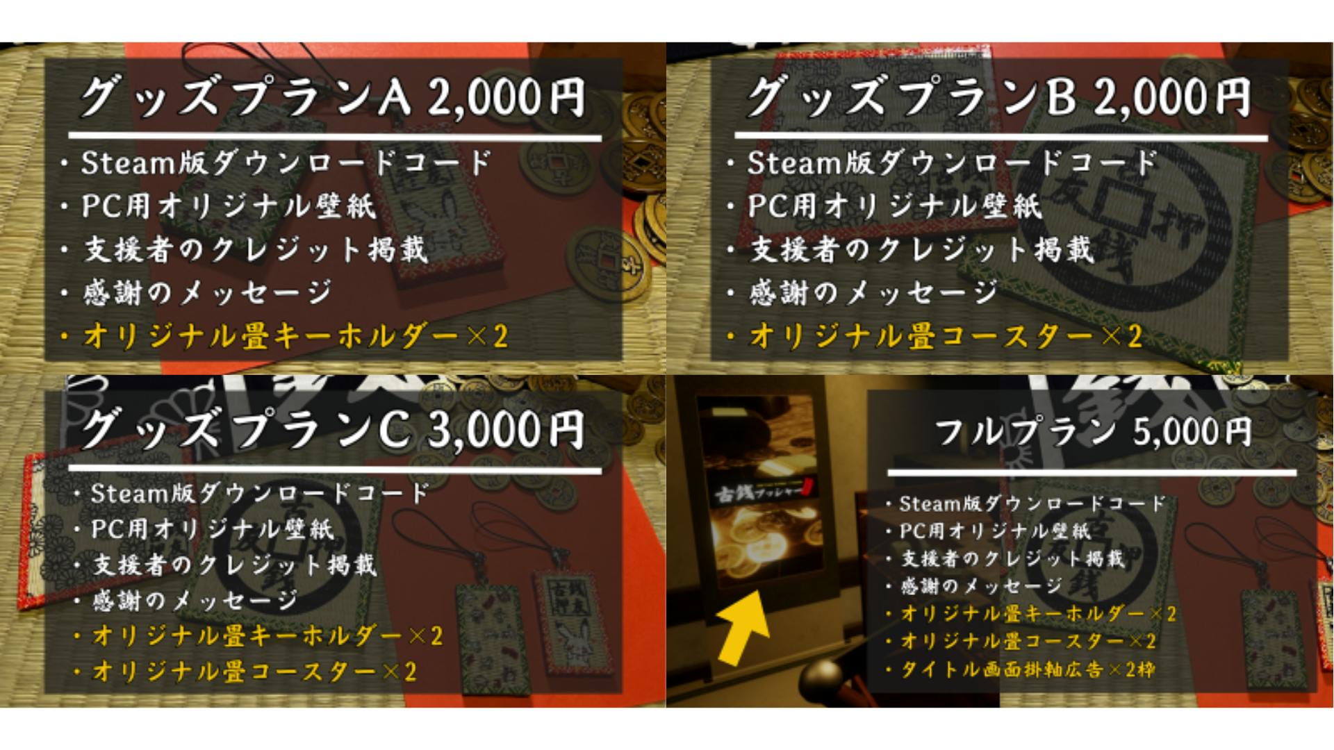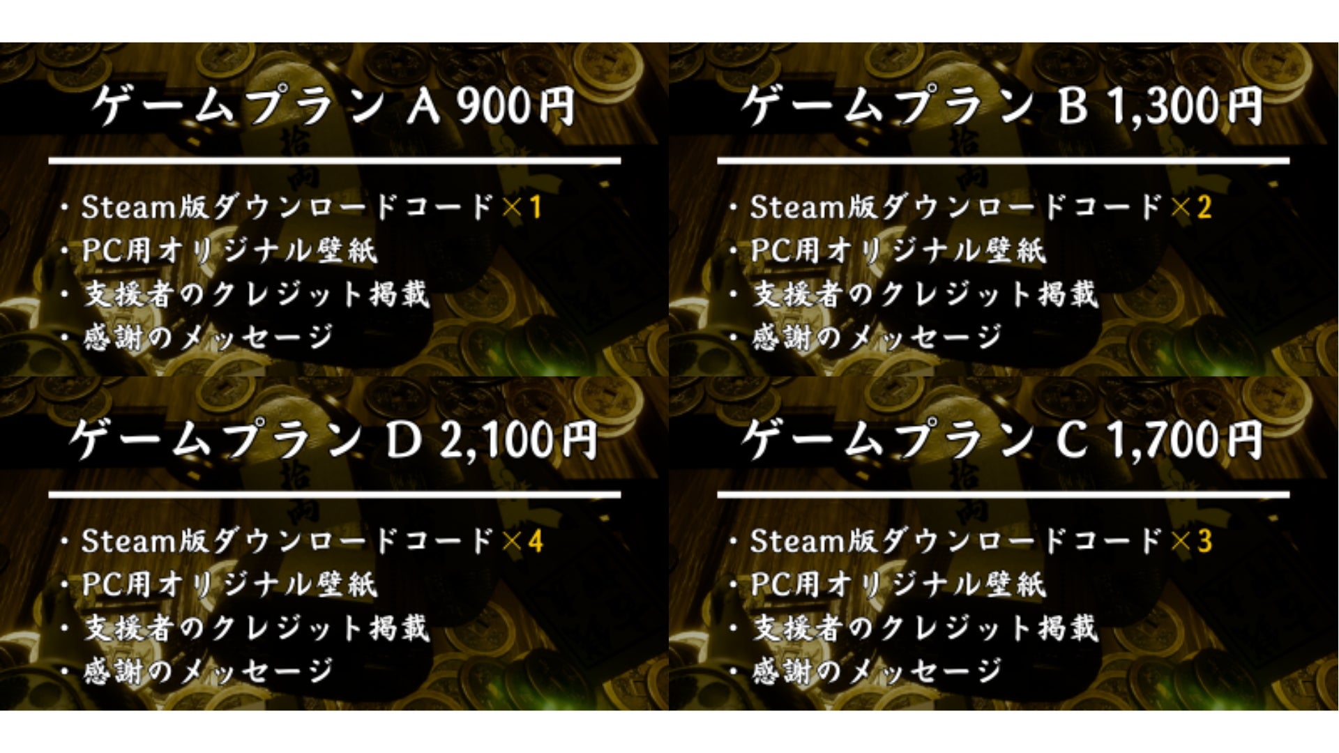友達と一緒に遊びやすいSteamキーの複数個セットやグッズプランなどがセットになったプランをご用意しました。