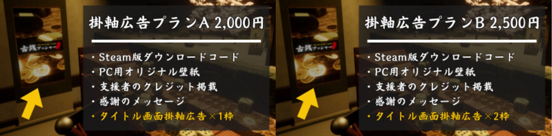 タイトル画面掛軸広告はタイトル画面にのみ表示されます。掛軸広告プランBでは2枠分の広告表示が可能です。(同じ広告を2枠分や別々の広告を表示させることも可能です)ゲームプレイ画面には表示されませんのでご注意ください