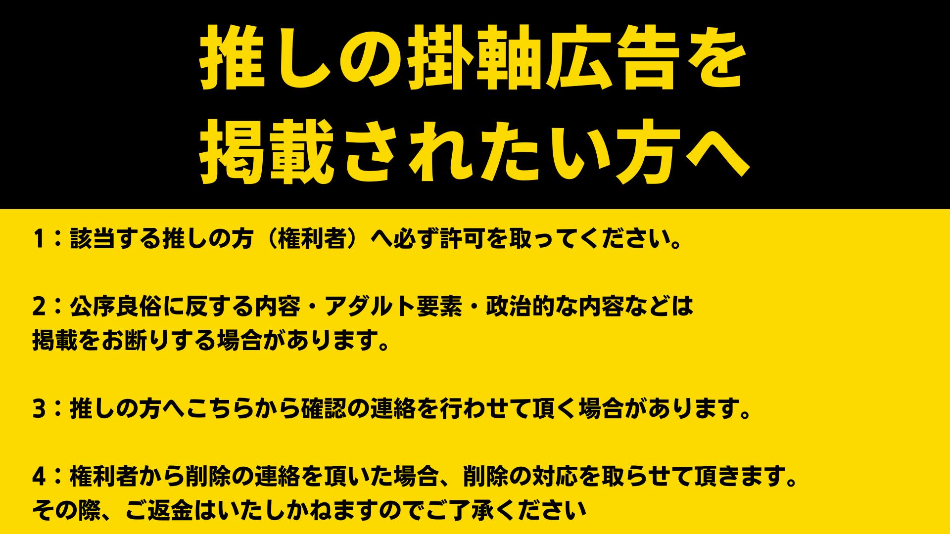 2024年7月21日(日)本プロジェクト終了。リターン送付開始。※掛軸広告プランご購入の方は広告について終了より前にご連絡させていただきます。※7月25日中に掛軸広告をお渡しいただけましたら発売日に実装が完了できます。