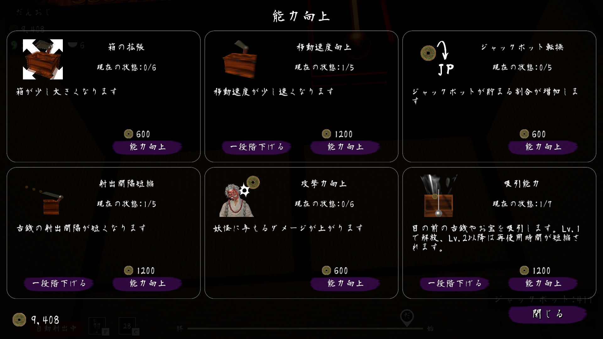 能力の向上には古銭を使ったものと勾玉を使ったものの2種類があります。古銭を使った能力向上はシューターの基本的な能力を底上げするものがメインです。勾玉を使った能力向上はマスで発生するイベントの強化やシューターに特別な能力を与えるものなどがあります。