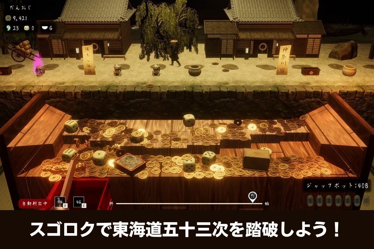「古銭プッシャーフレンズ参」は和風の世界観と音楽を聞きながら最大4人のマルチプレイでゆる~く遊べるメダルゲームと、東海道五十三次の踏破を目指すスゴロクが融合したゲームです。