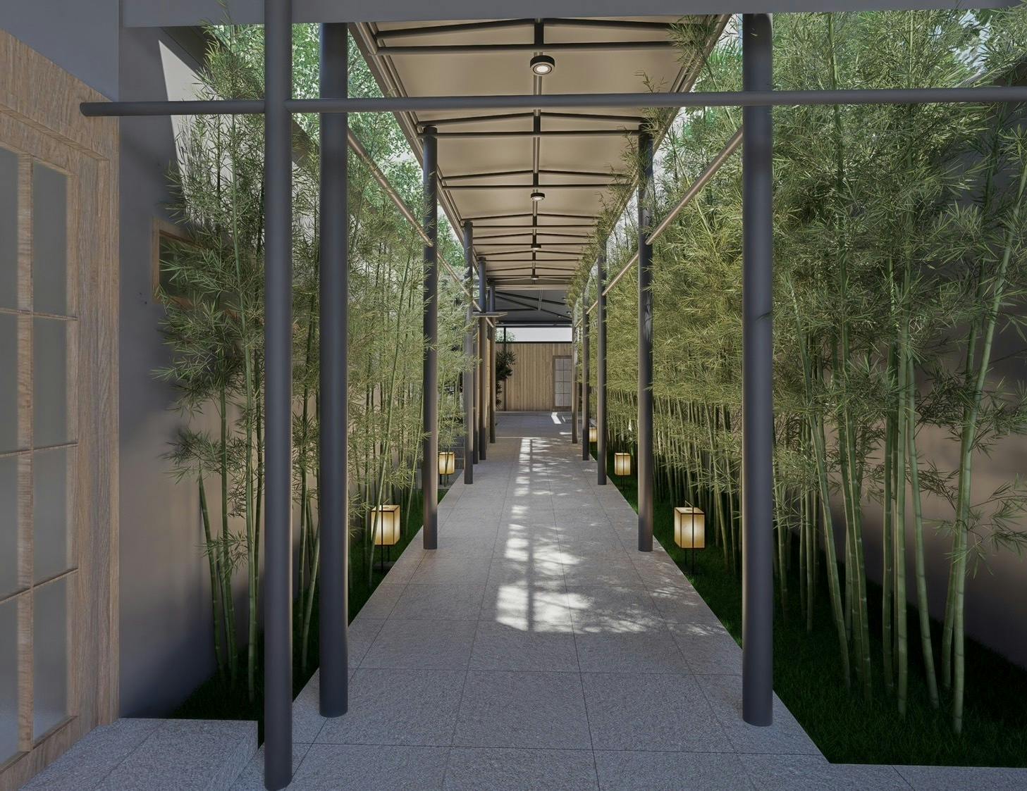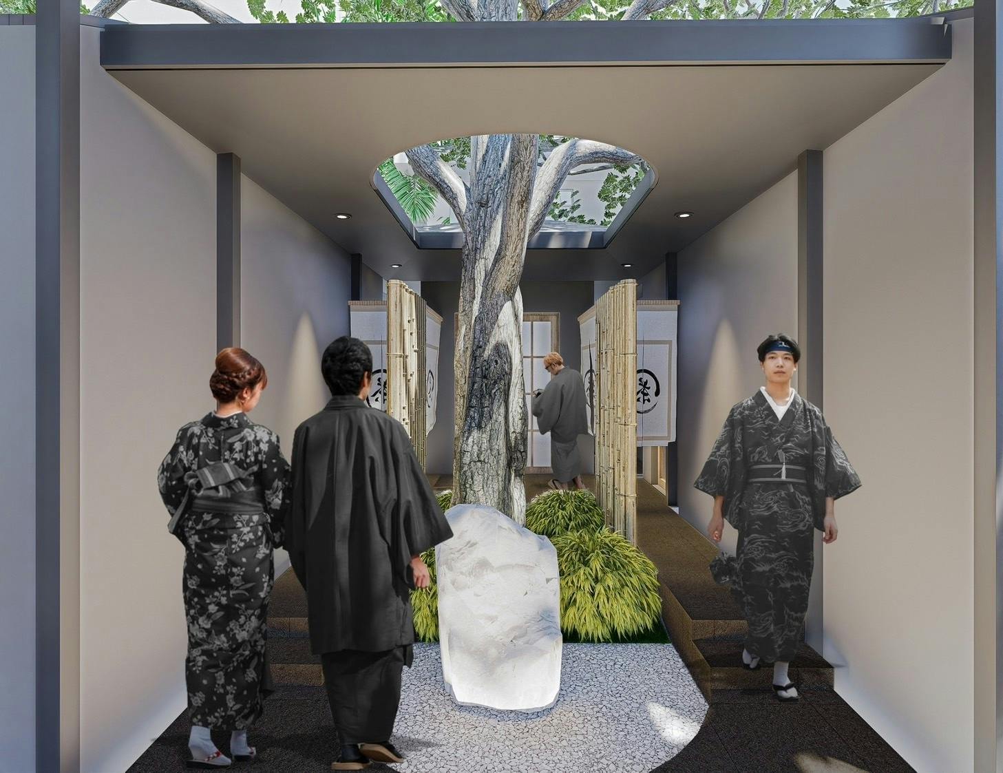 (↑完工後玄関CG。玄関だけだとそこまで変わってなさそうに見えるかもしれませんが、この奥の庭エリアに新築で更衣室やサウナ棟を建てています!笑)