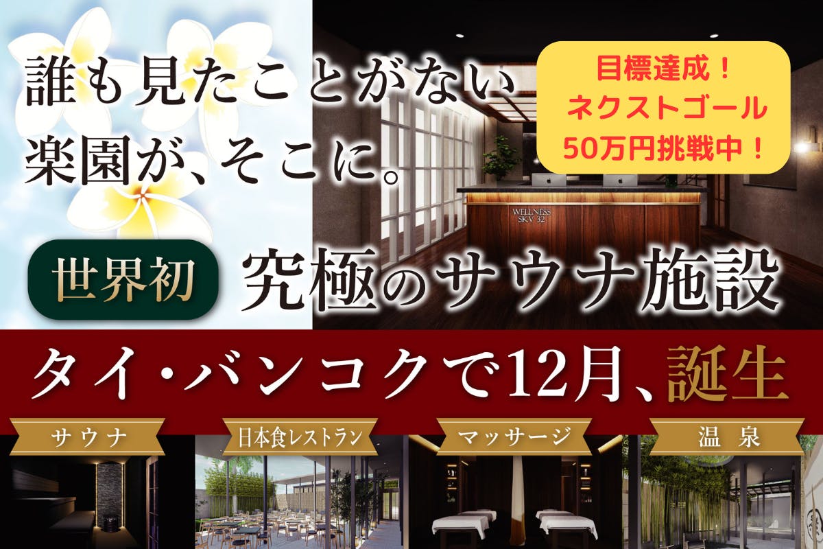2024/10/30 12:40支援いただいた皆様へこの度は当プロジェクトにご支援いただきありがとうございました!おかげ様で、【クラウドファンディング目標金額達成】することができました!!これのひとえに皆様の支援の賜物です。。!!正直まさか日本から遠く離れたタイのプロジェクトでここまで多くの方にご支援いただけるとは思ってもみませんでした。。改めて当プロジェクトのポテンシャルを痛感したところであります!そこでネクストゴールとしまして、【50万円】を目標として頑張っていきたいと思います!!マッサージとサウナ、飲食のセットプラン等は現在クラウドファンディングでしか出していない特別メニューですので、是非皆様サウナやタイに興味ある方々などに拡散いただけますと幸いです。どうぞよろしくお願いいたします。Japan Sauna&Spa(Thailand)Ltd.Managing Director山本真輝 もっと見る