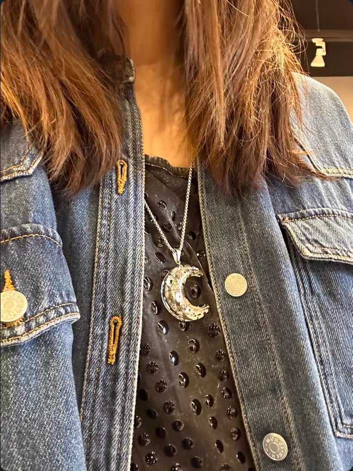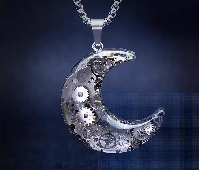 神秘的な月と精巧な歯車が融合した、唯一無二のデザイン。時計の内部メカニズムを思わせるギアが、静かに時を刻みながら、あなたのスタイルに未来的でクラシックなアクセントを加えます。シンプルでありながら目を引くこのネックレスは、ファッションにこだわる方にぴったりの一品です。