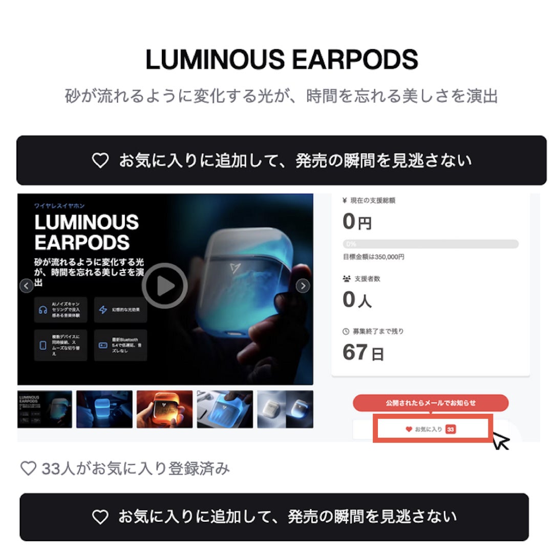 さらに、新たなプロジェクトも11/20 20:00にスタート予定です!今回は、世界初!砂時計のように流れるイヤホンが登場します。スタイリッシュで未来的なデザインをお楽しみいただけるアイテムとなっておりますので、ぜひご期待ください。