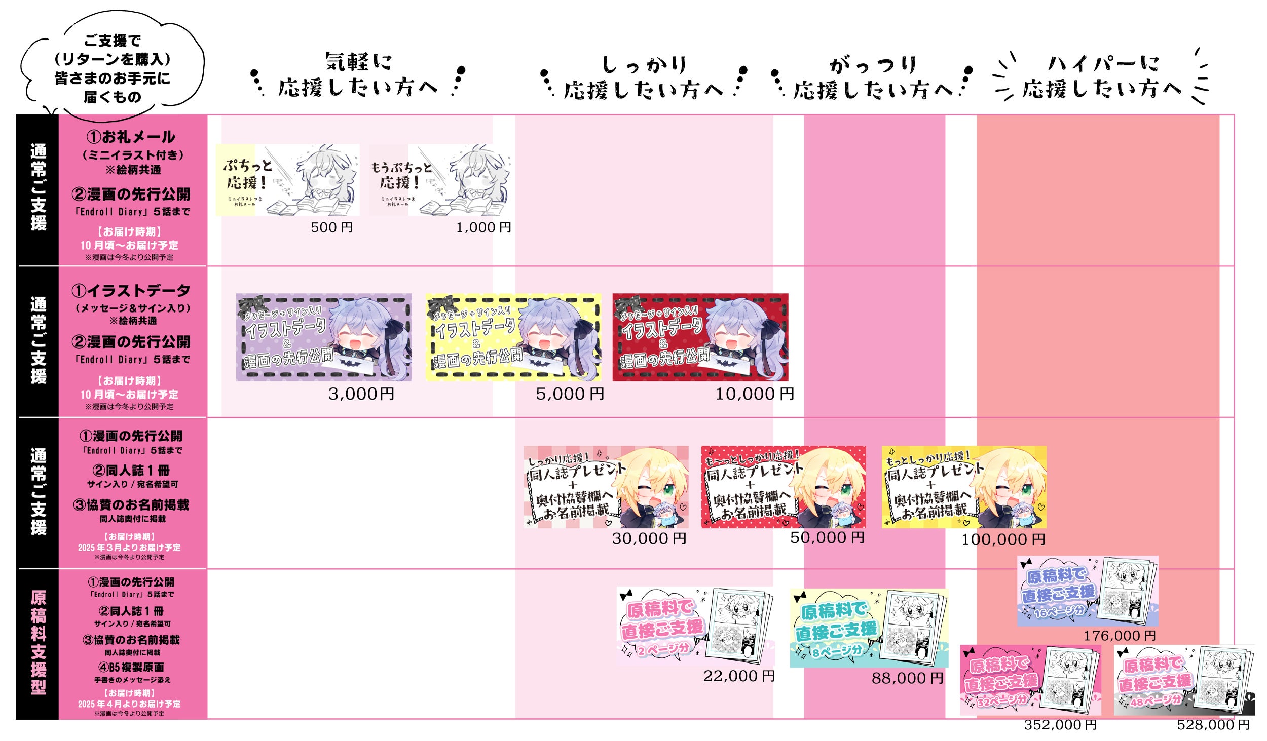 ご支援と一緒に作品を楽しんでいただける内容をご用意いたしました。