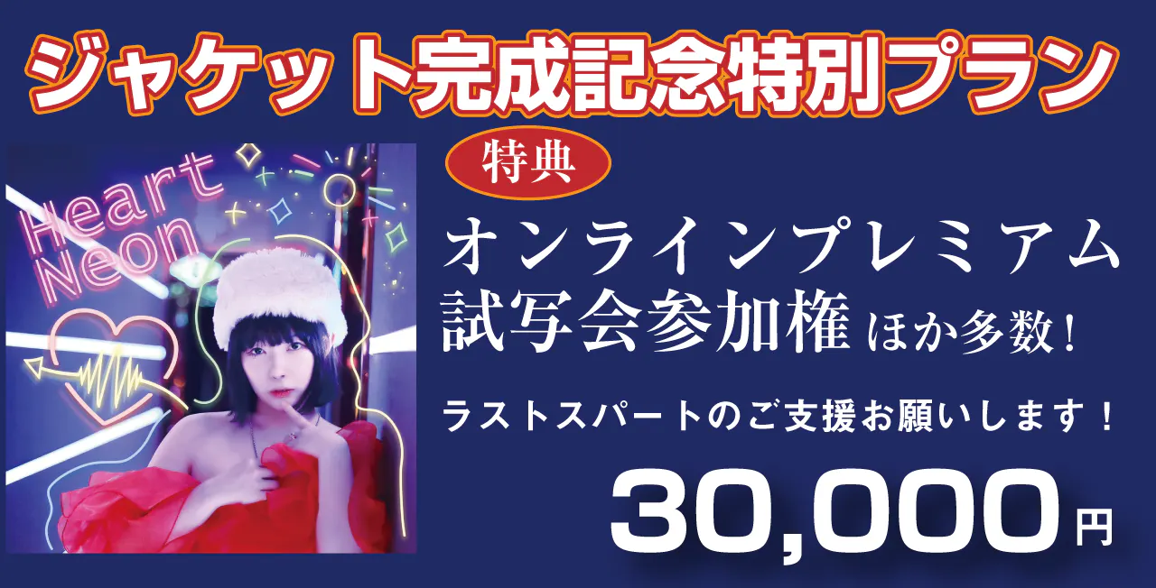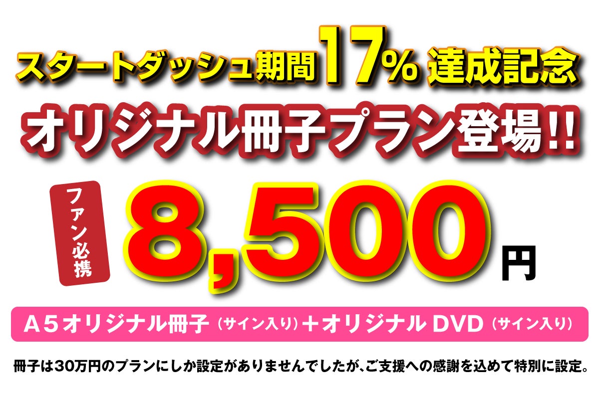 これまで30万円のプランにのみ設定をさせていただいておりましたオリジナルブックレット(高級冊子)を、スタートダッシュ期間17%達成のお礼といたしまして、8,500円でお届けさせていただくプランを新規設定いたしました。ブックレットには、なの小夕子さんの直筆サイン入!!また、今回特別にサイン入り新曲DVDもセットさせていただきます。なの小夕子ファン必携の非売品!!大手フォトスタジオ契約フォトグラファーが撮影した、とても貴重な冊子です。